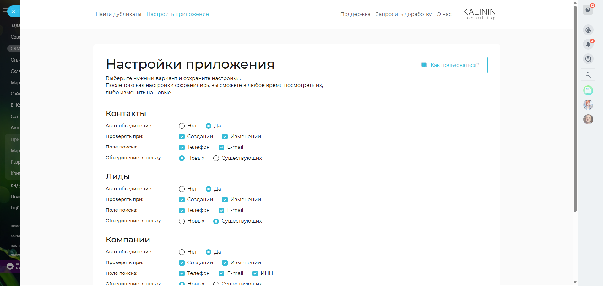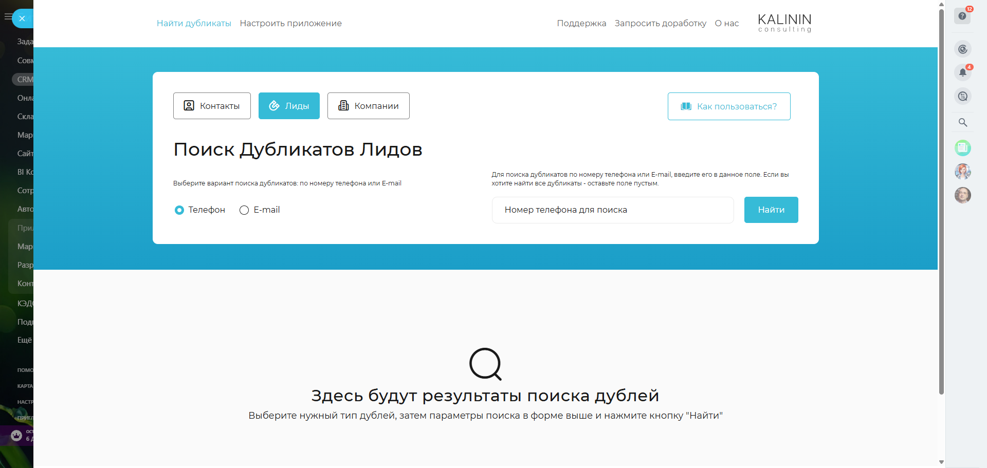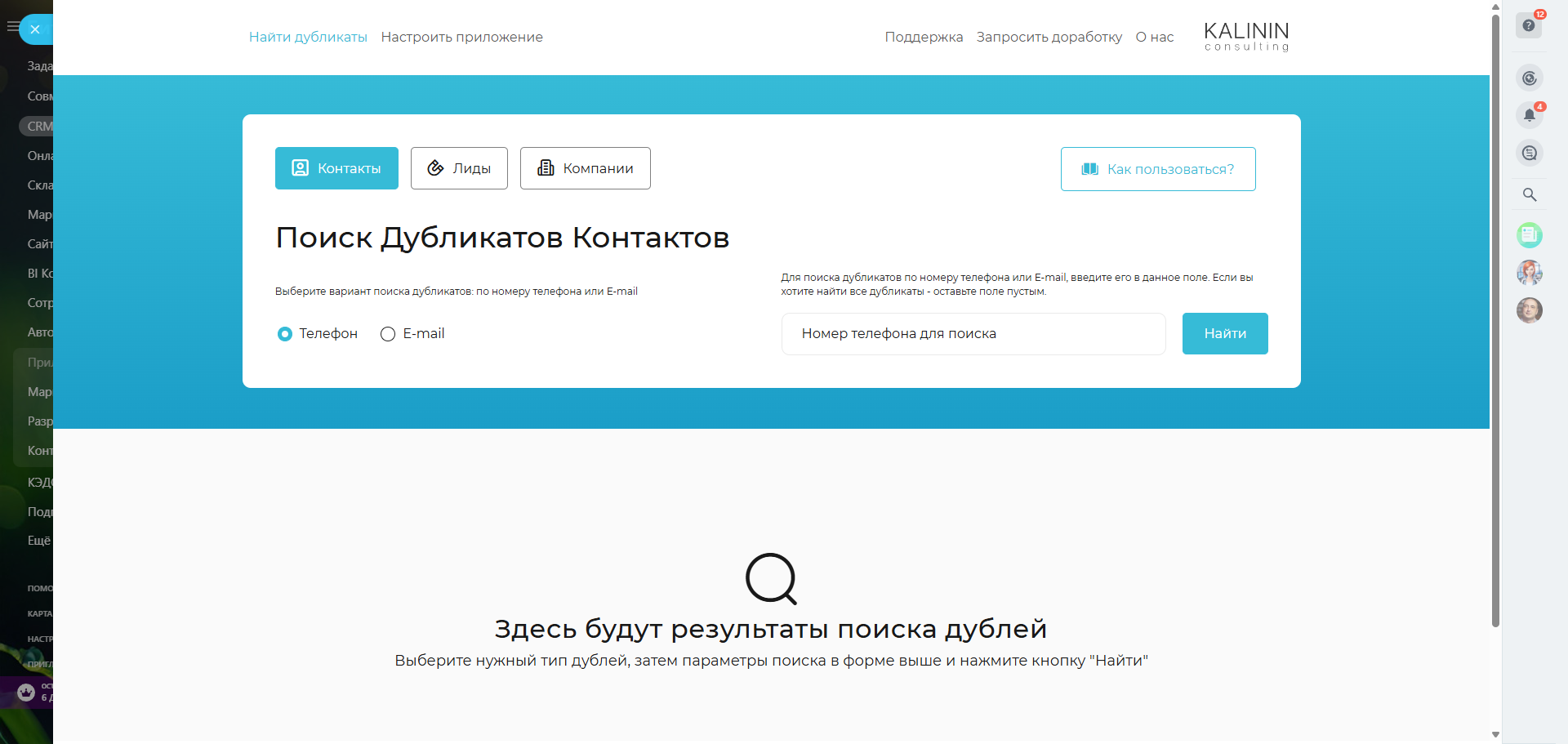 Контроль дублей - приложение для ручного и автоматического поиска и объединения дубликатов Лидов, Контактов, Компаний по номеру телефона, E-mail, ИНН