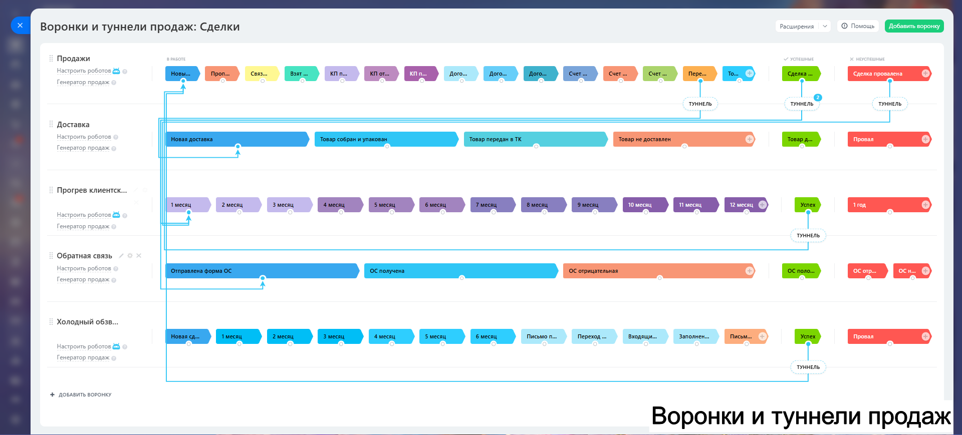Наше готовое решение — это полный цикл автоматизации продаж для розничного бизнеса. Система объединяет 5 ключевых воронок, охватывающих все этапы работы с клиентом: от первой заявки до доставки и повторных продаж.