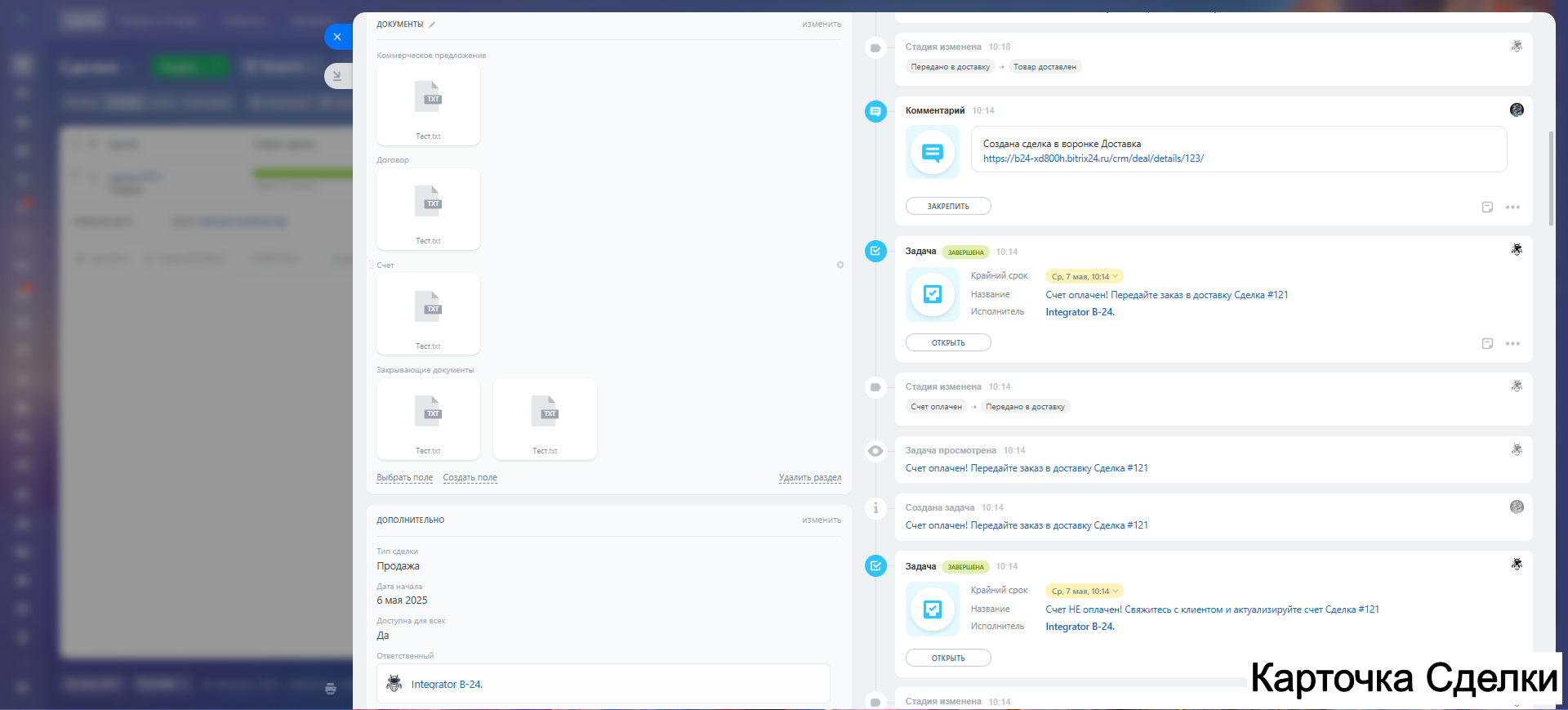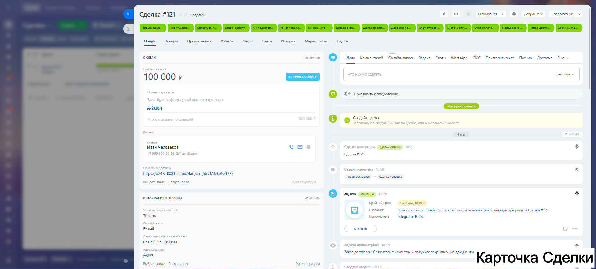 1. Клиент оставляет заявку → система фиксирует сделку в воронке продаж.