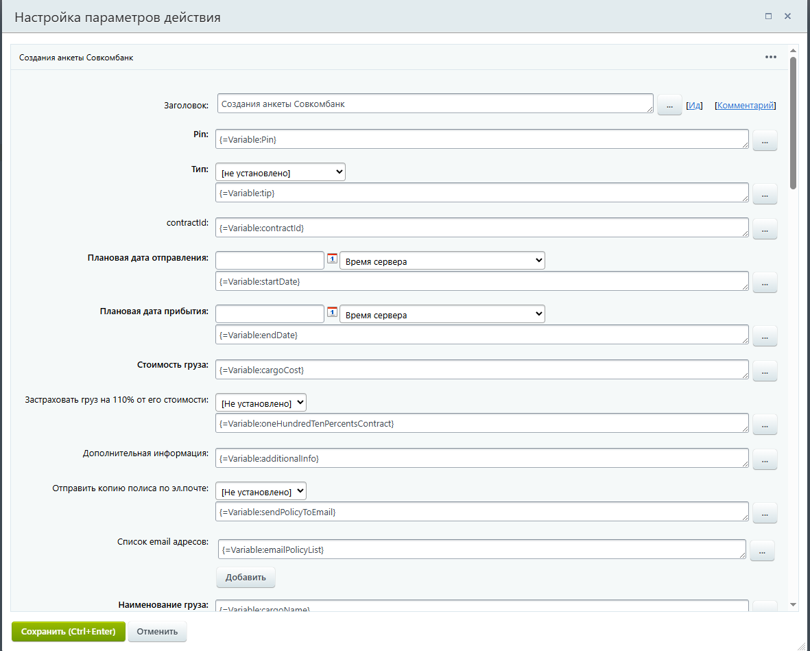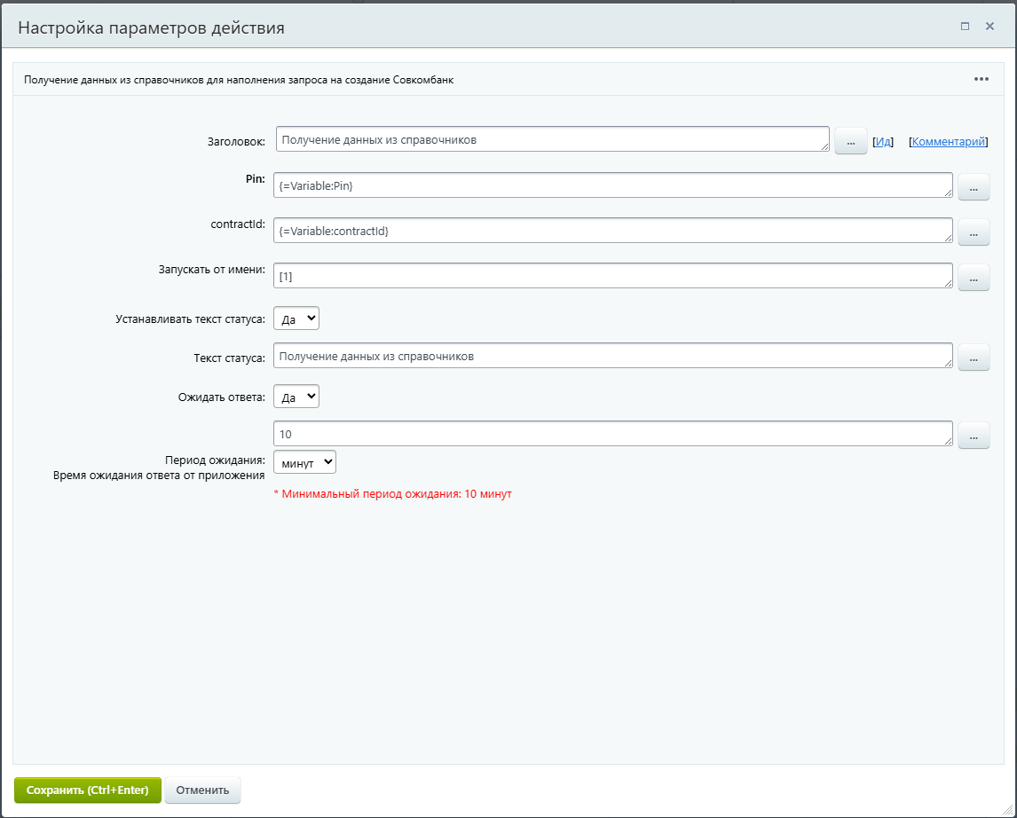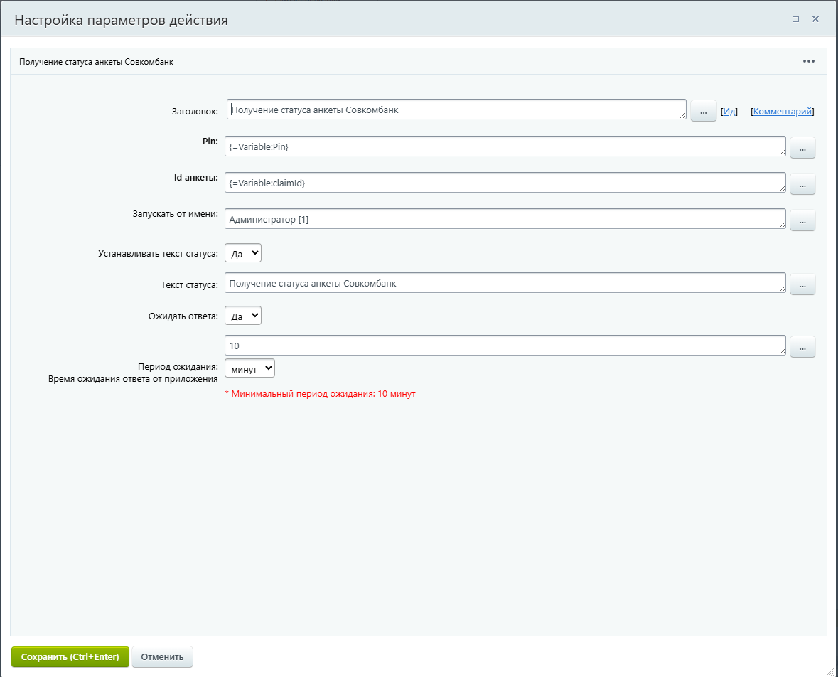 2. С помощью действия «Создание анкеты…» оправить анкету в сервис. В ответ будет получен id анкеты. Сохраните его в переменной или поле элемента для получения статуса этой анкеты.