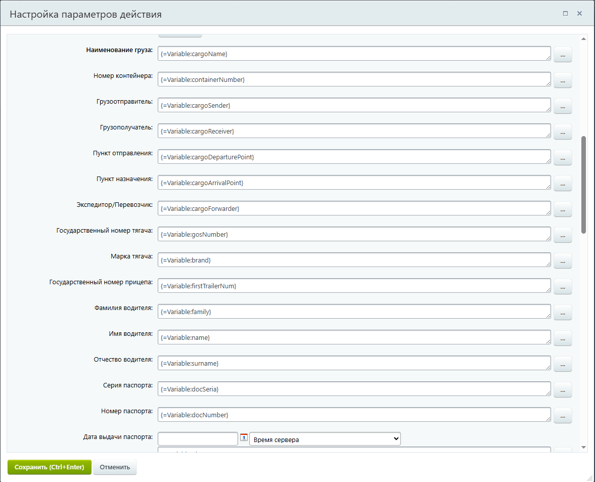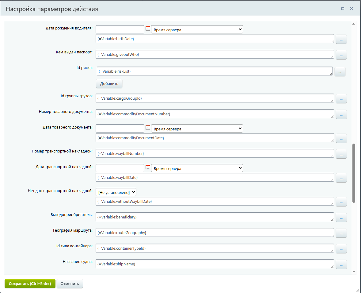 1. Получить списки рисков и групп грузов с помощью действия «Получение данных». Эти параметры нужны для подачи анкеты.