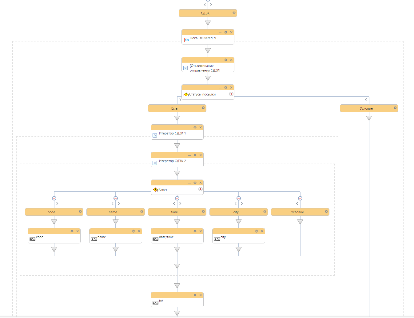 Возвращаемый параметр "statuses" необходимо передать в Итератор 1. Внутри Итератора 1 поставить Итератор 2, в который передать Значение Итератора 1. Внутри Итератора 2 по ключу разобрать значения массива statuses.