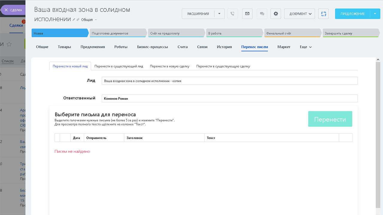 Приложение "Перенос писем" не только предоставляет удобный интерфейс для работы с письмами (показывая, среди прочего, начало письма, что позволяет легче ориентироваться в большом их количестве), но и позволяет переносить их между любыми Лидами и Сделками, создавая при необходимости новые. Клиент прислал новую заявку, пока не закрыта предыдущая Сделка? Создаём новый Лид (или сразу Сделку в нужной воронке) и переносим письмо туда. Клиент прислал уточнение к предыдущей заявке, и из него создался новый Лид? Переносим письмо в нужный. Случайно отправили Клиенту письмо не из той Сделки (и теперь ответы будут падать тоже не туда, куда нужно)? Переносим отправленное письмо в нужную Сделку. Те, кто пользуется штатным переносом писем между Сделками, наверняка сталкивались с ситуацией, когда письмо в Сделке отображается, но перенести его нельзя, - приложение "Перенос писем" решает и эту проблему.