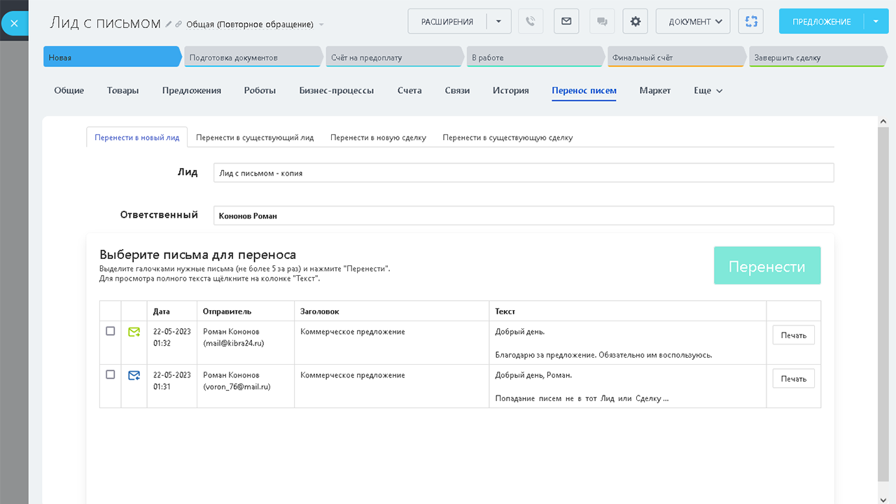 Перенос писем между Лидами или Сделками (с возможностью создания новых), а также их распечатка.