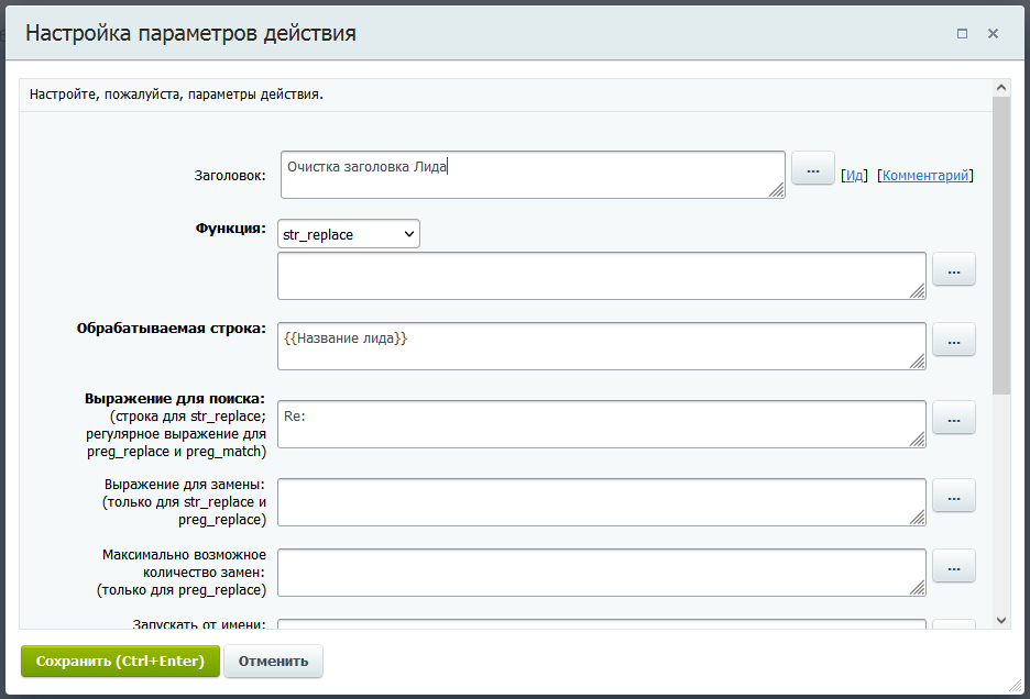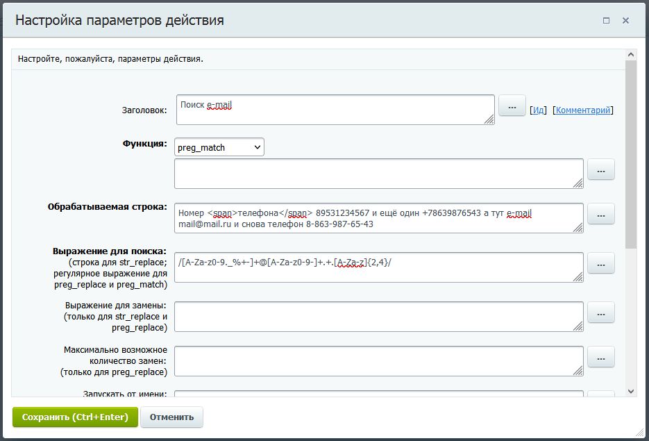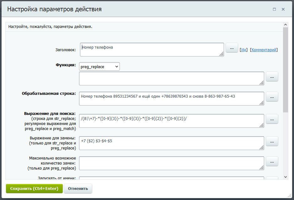 В бизнес-процессах и роботах нередко возникает потребность в автоматической замене части текста. Это может быть форматирование номера телефона, e-mail или адреса; удаление лишних пробелов или ненужных знаков (например, html-тегов); подстановка значений в шаблоны и ещё множество других задач. Всё это можно сделать с помощью этого Действия, реализующего PHP-функции str_replace (замена по строке) и preg_replace (замена по регулярному выражению). С их помощью можно: