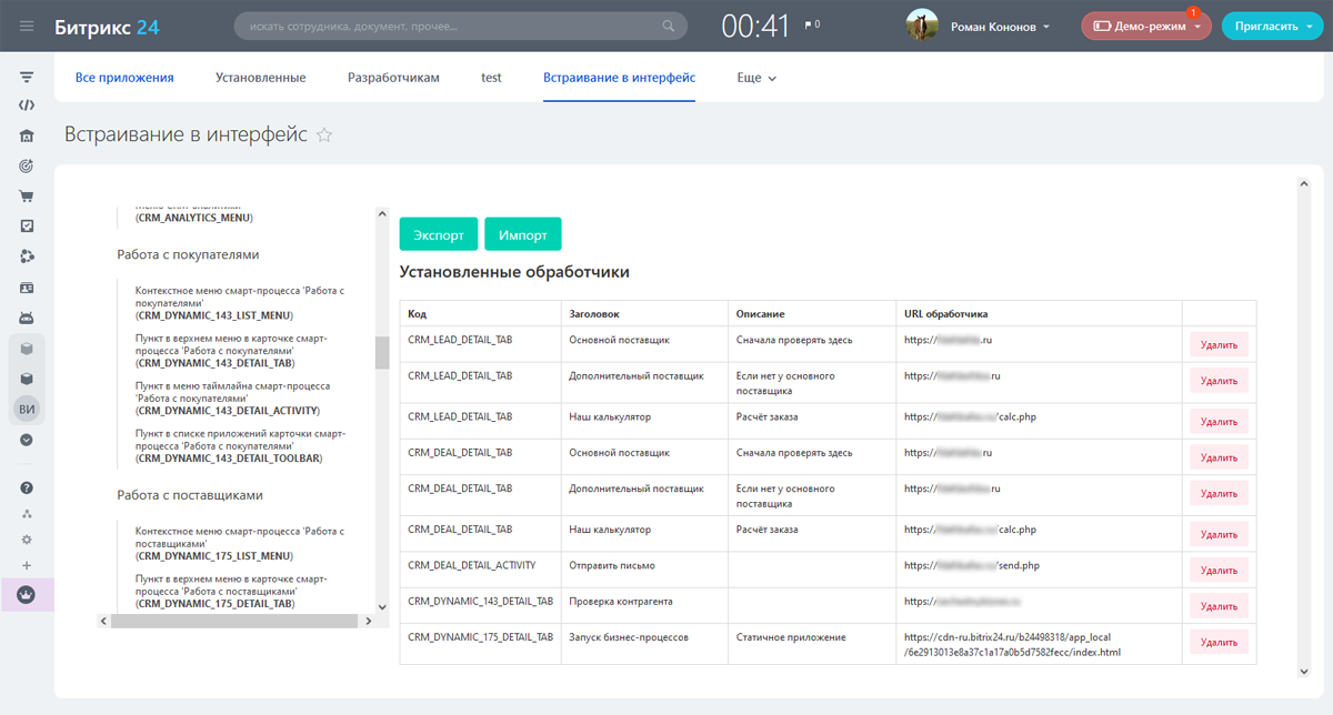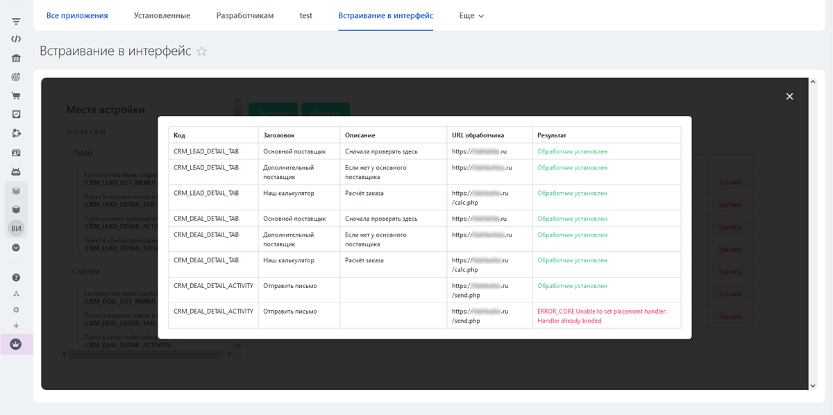 В основной части интерфейса (правая колонка) отображается таблица со списком зарегистрированных через приложение обработчиков мест встраивания (код места; заголовок, который выводится по месту встраивания; описание, которое может выводиться по месту встраивания; URL обработчика и кнопка удаления). Кнопки "Экспорт" и "Импорт" позволяют, соответственно, сохранить список зарегистрированных обработчиков в csv-файл и массово зарегистрировать обработчики из csv-файла. Если список зарегистрированных обработчиков пуст, по кнопке "Экспорт" сохраняется образец файла для импорта, содержащий колонки в нужном порядке.