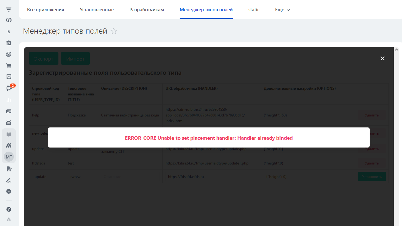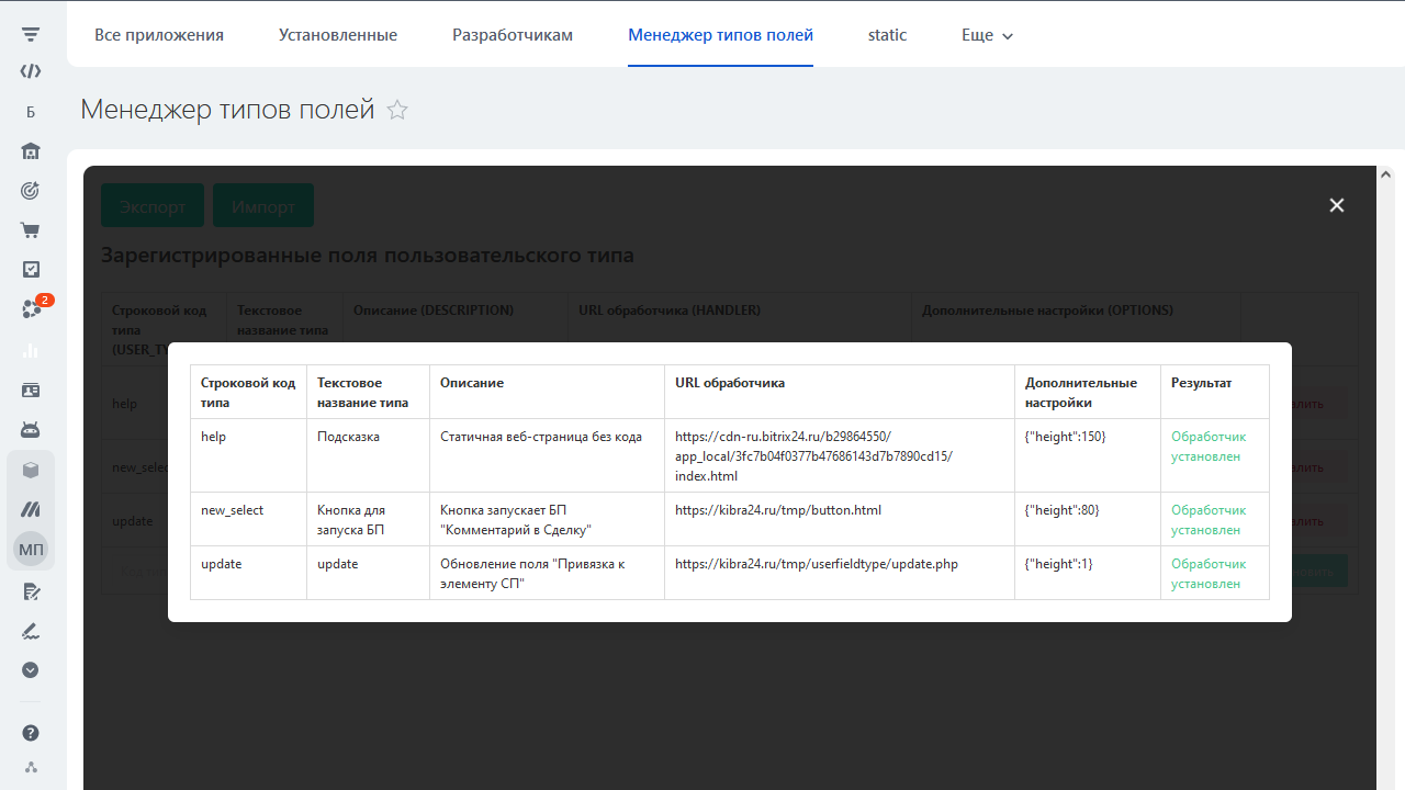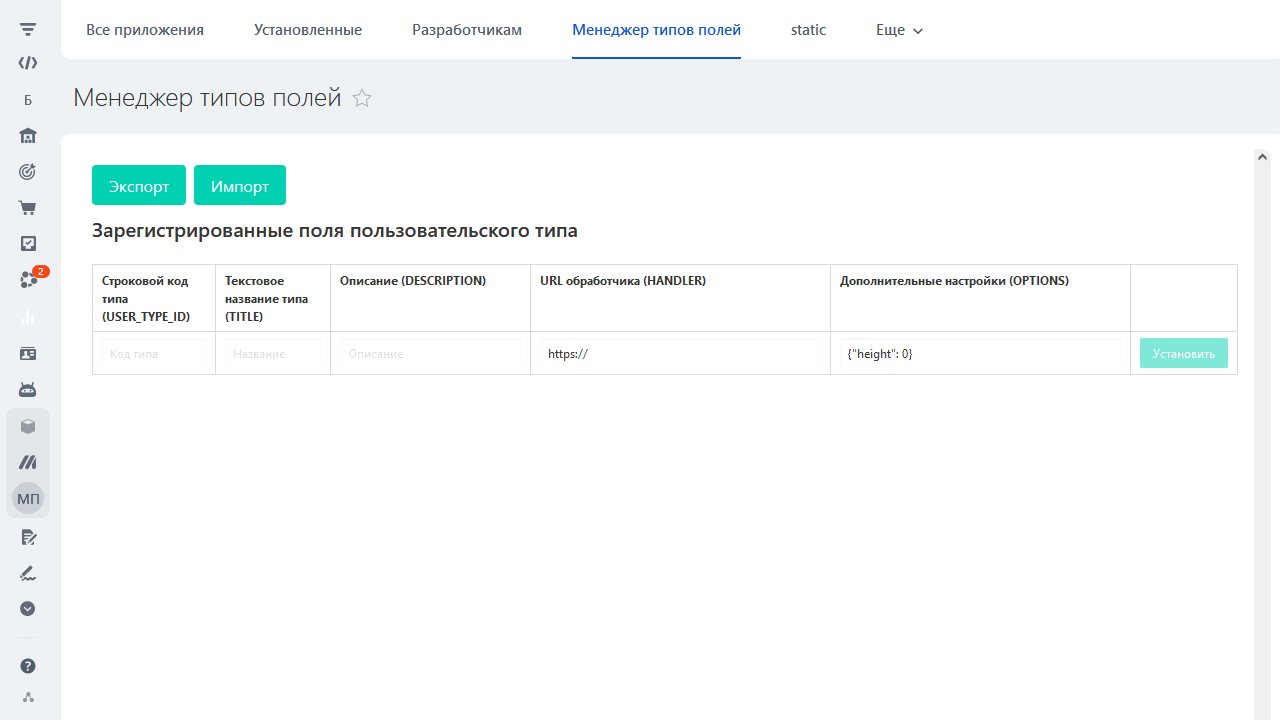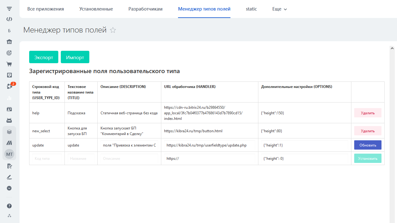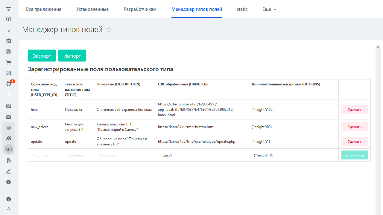 Основная часть интерфейса - таблица со списком зарегистрированных через приложение пользовательских типов полей (строковый код типа; текстовое название типа; описание, которое выводится в списке типов полей в карточке CRM; URL обработчика; дополнительные настройки и кнопка удаления). Кнопки "Экспорт" и "Импорт" позволяют, соответственно, сохранить список созданных типов полей в csv-файл и массово зарегистрировать их из csv-файла. Если список зарегистрированных типов полей пуст, по кнопке "Экспорт" сохраняется образец файла для импорта, содержащий колонки в нужном порядке.