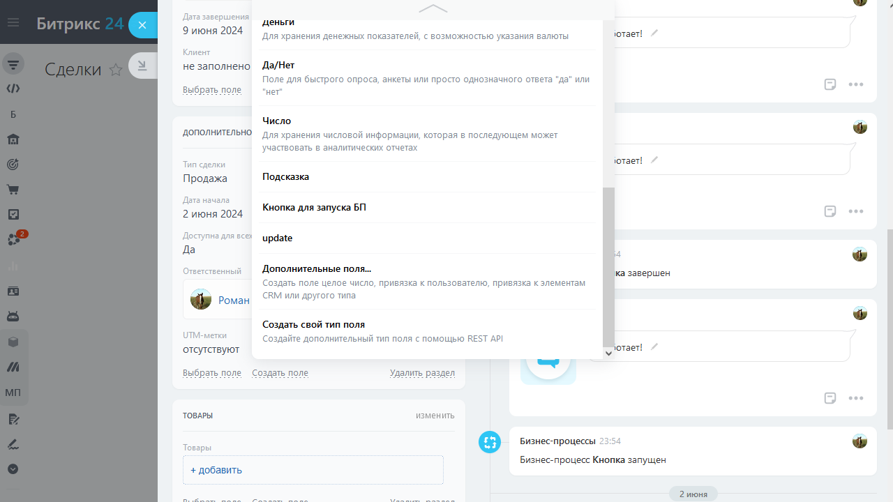 Последняя строка в таблице - форма для регистрации нового типа полей. Заполните необходимые поля, нажмите кнопку "Установить" - и новый тип поля будет доступен в CRM.