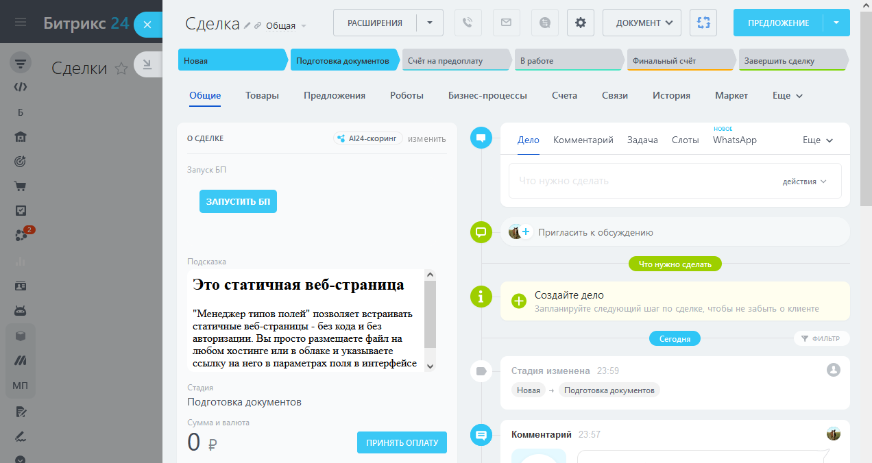 Приложение предназначено для облегчения процесса разработки приложений, регистрирующих пользовательские типы полей в Битрикс24, а также для упрощения администрирования таких типов. Теперь разработчикам не нужно писать инсталлятор (что вызывает затруднение у многих начинающих разработчиков), а администратор видит все встройки в одной табличке и может легко устанавливать и удалять их. Интеграторам, использующим пакет своих приложений, нет необходимости устанавливать их по одному - можно воспользоваться импортом из csv-файла, установив все разом (а также сохранить конфигурацию встроек, экспортировав их в csv-файл). Более того: приложение можно вообще не устанавливать на портал, если оно может работать через вебхуки: достаточно прописать нужный вебхук самом приложении и указать ссылку на него в качестве обработчика. Можно встроить статичную html-страницу, не содержащую никакого кода, а только текст и HTML-разметку. Можно встраивать даже статичные приложения, работающие через библиотеку BX24, то есть не нужен собственный сервер с доменом и SSL-сертификатом!