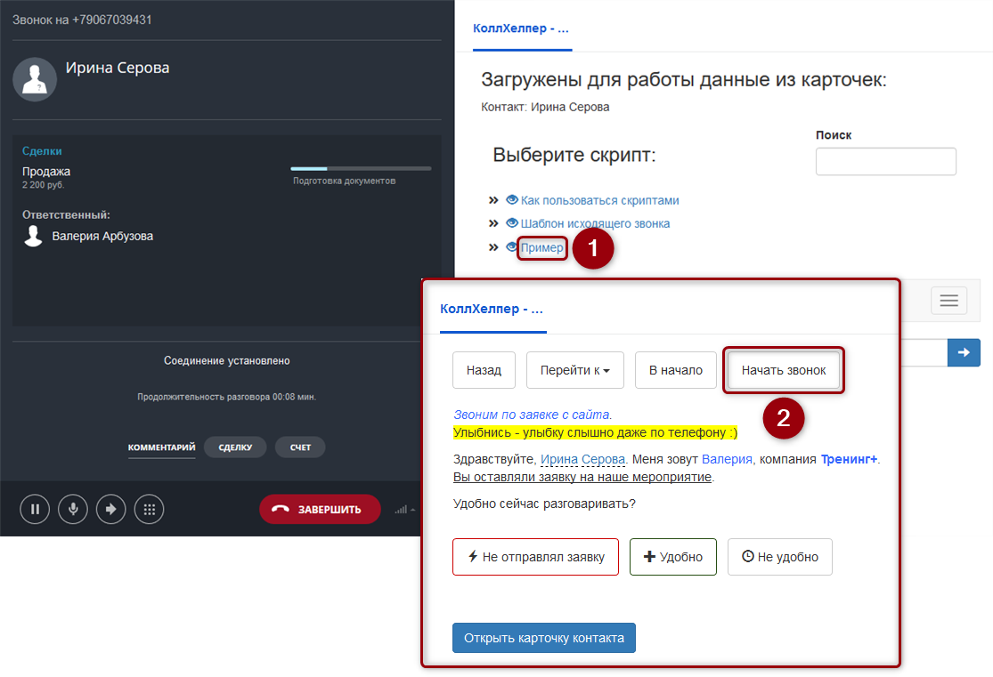 Полная интеграция с CRM - данные о клиенте, лиде, сделке и компании - прямо в тексте скрипта и доступны для редактирования.