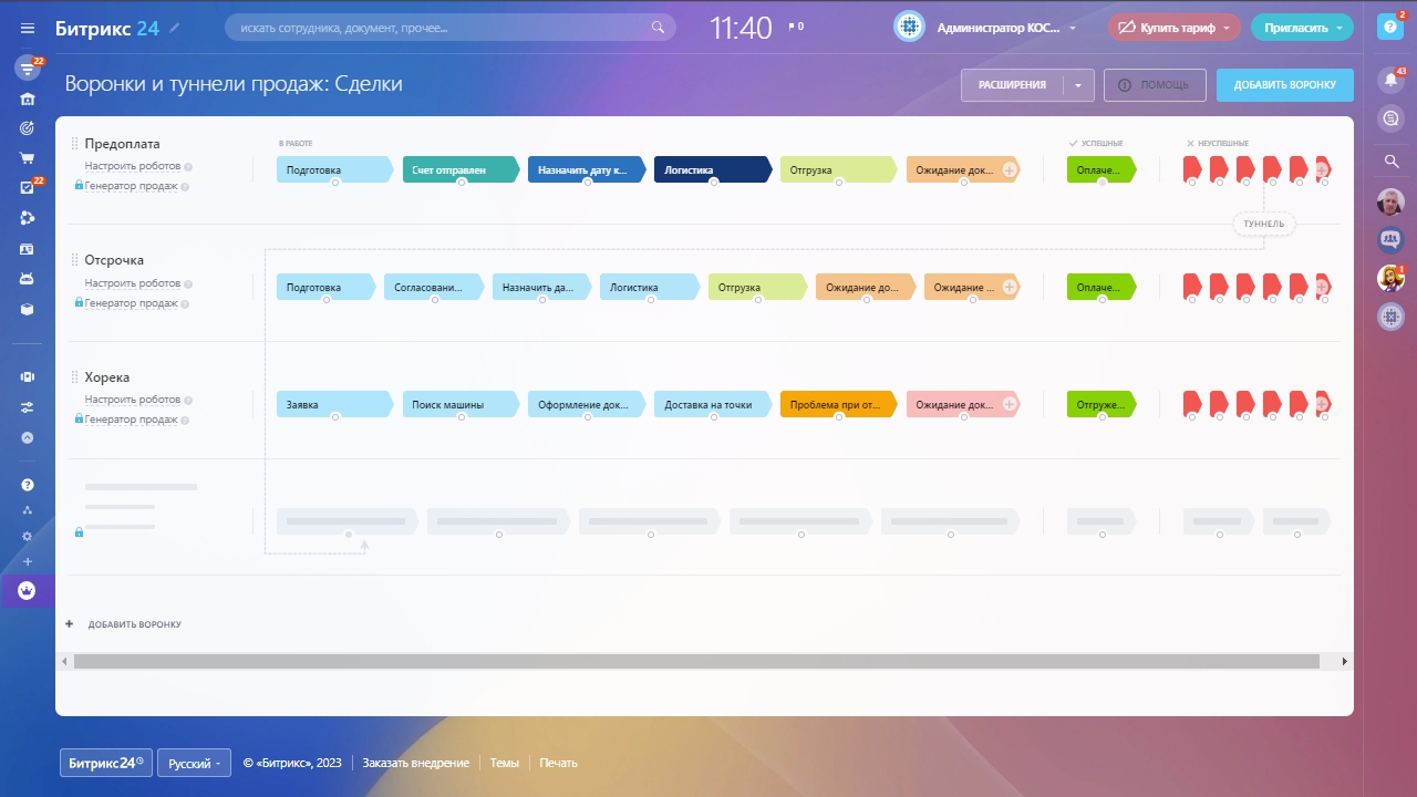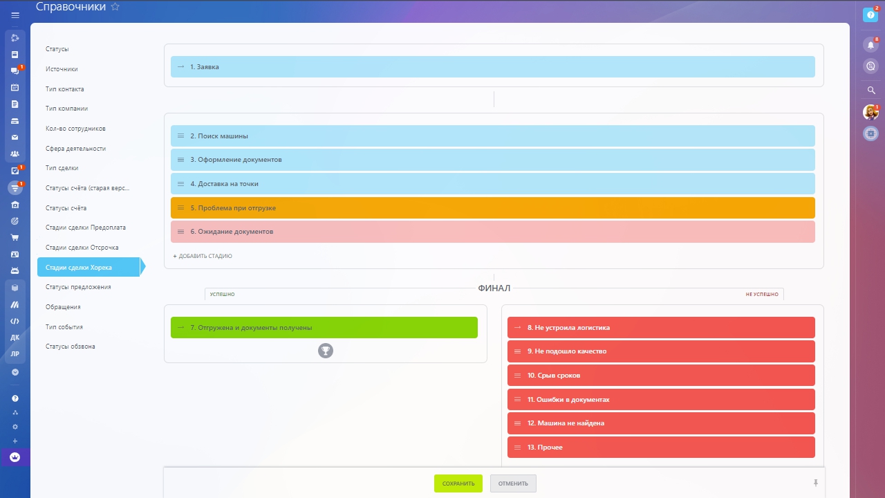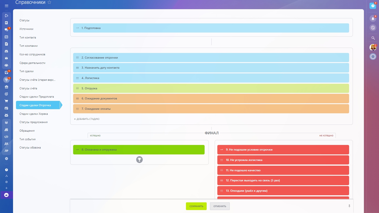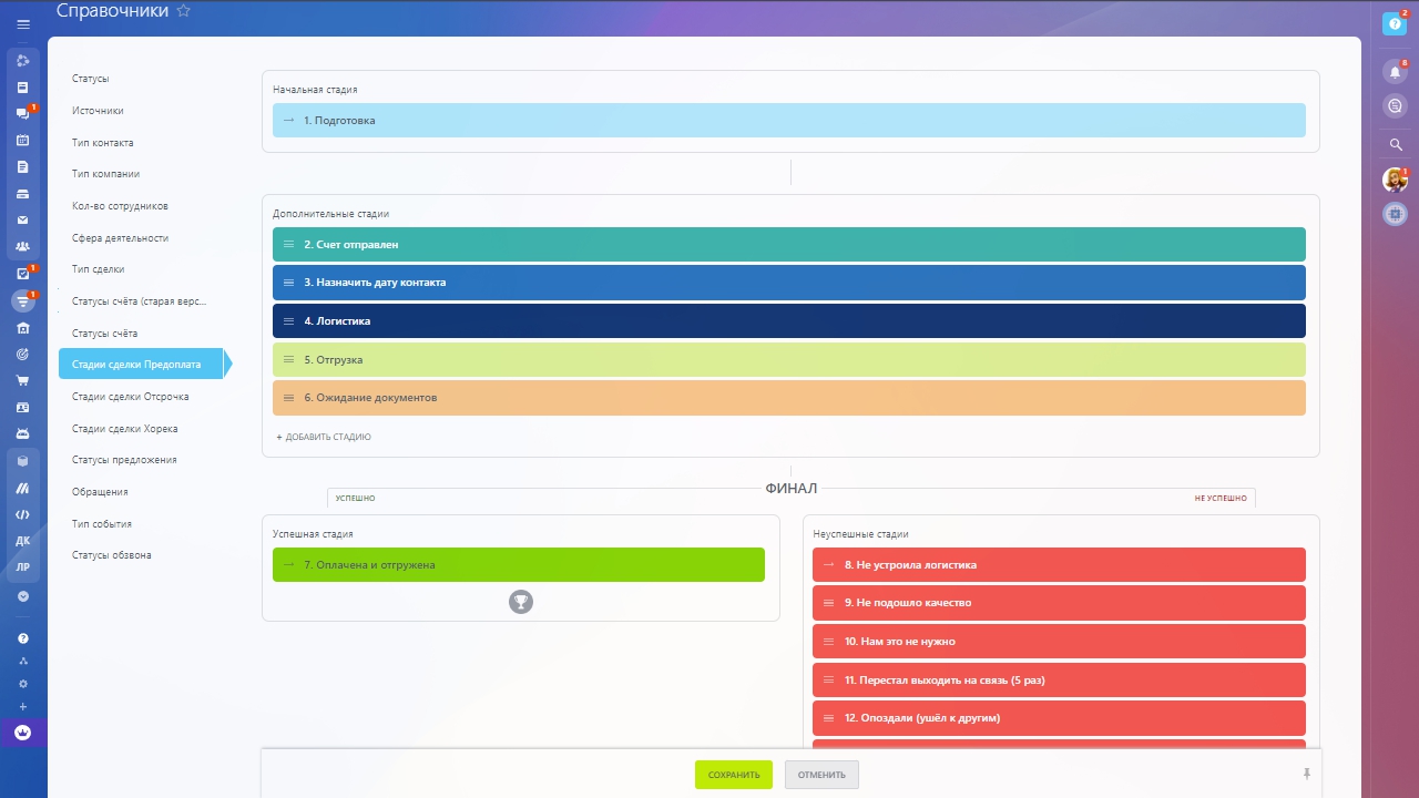 - Настроены воронки Сделок - Для каждого направления выбраны оптимальные стадии.