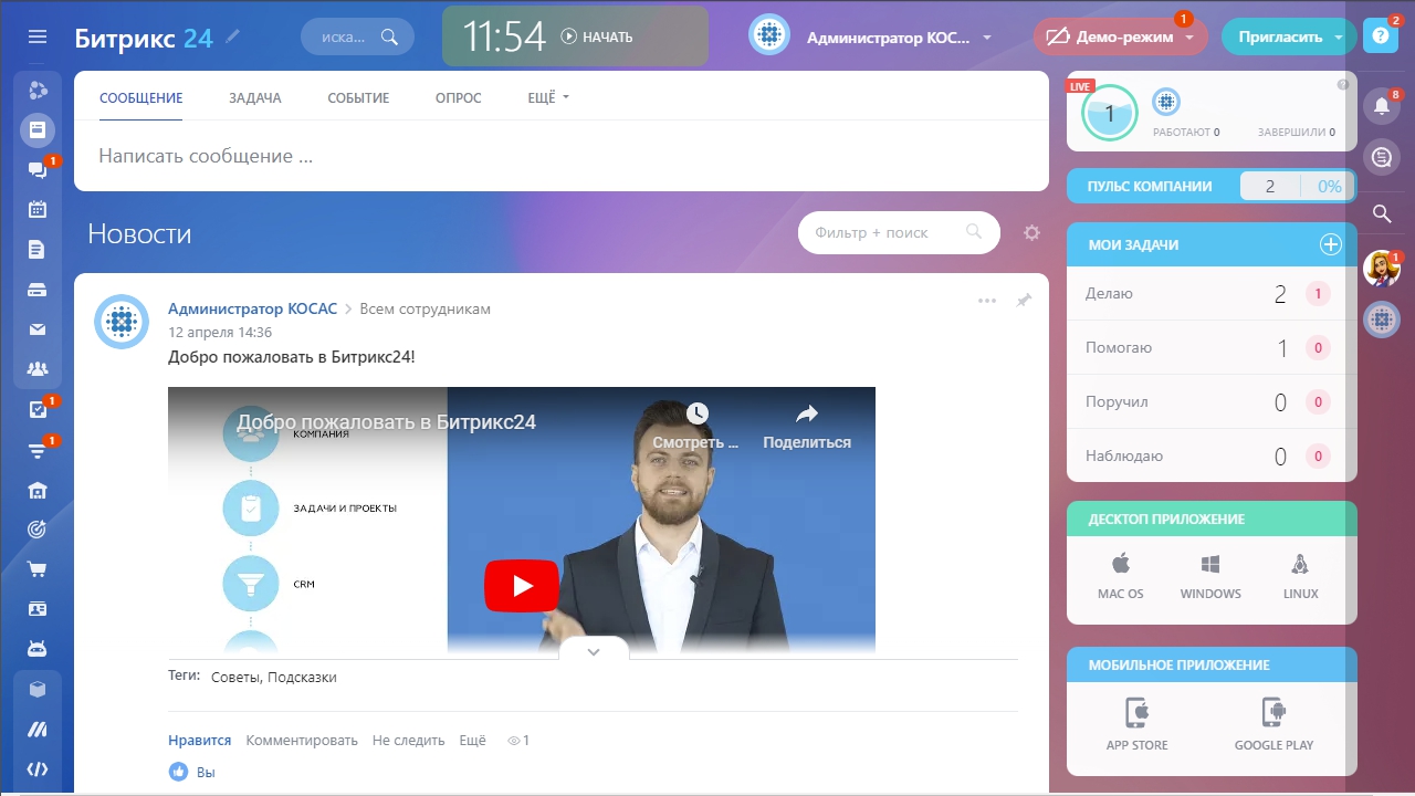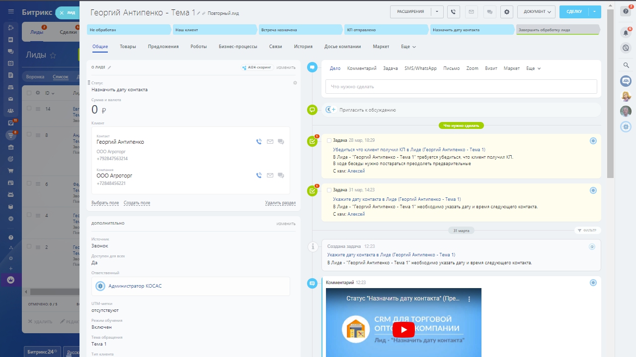 - Режим обучения - В карточках сущностей Лид, Сделки встроены видео подсказки с инструкциями.