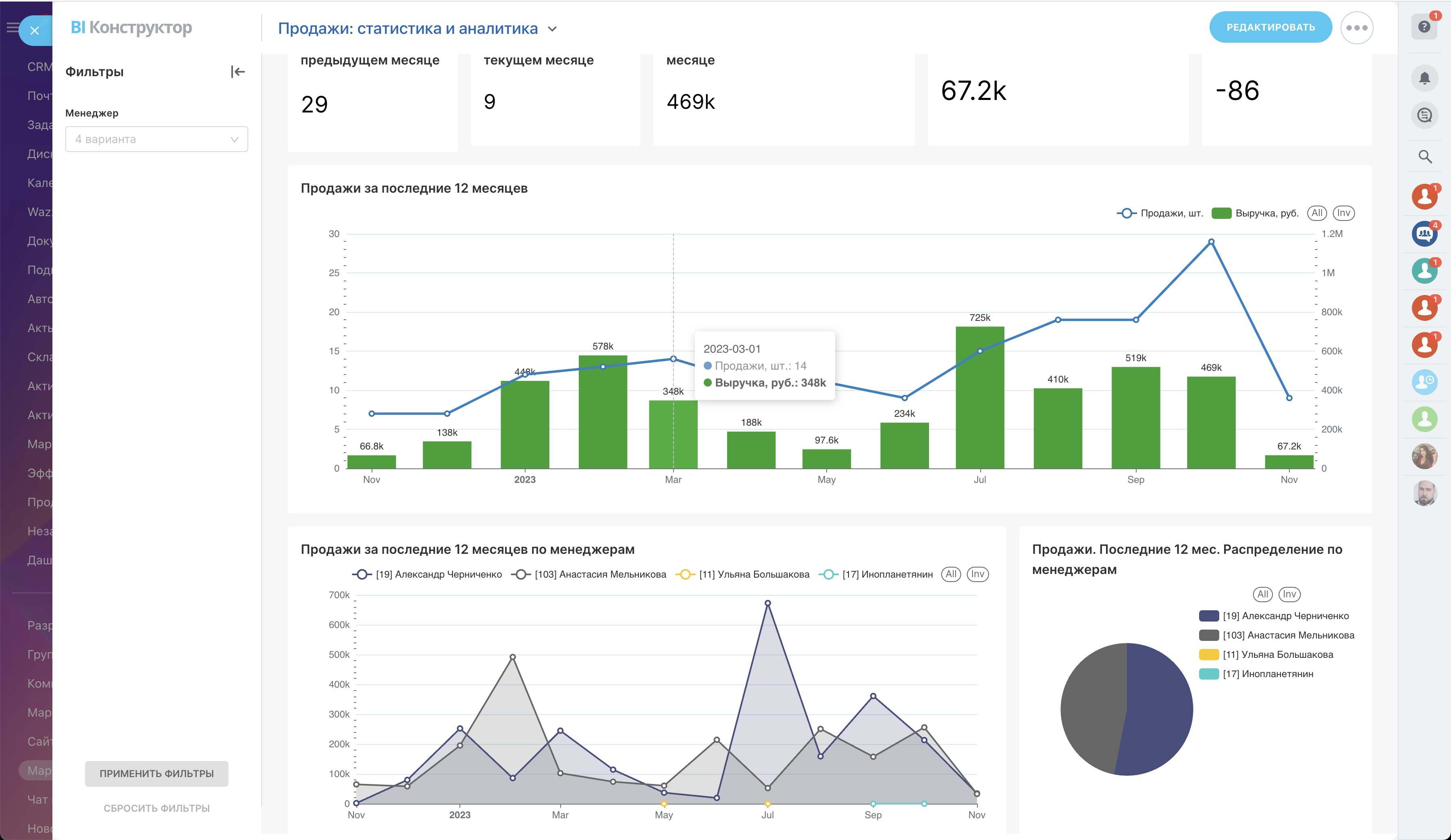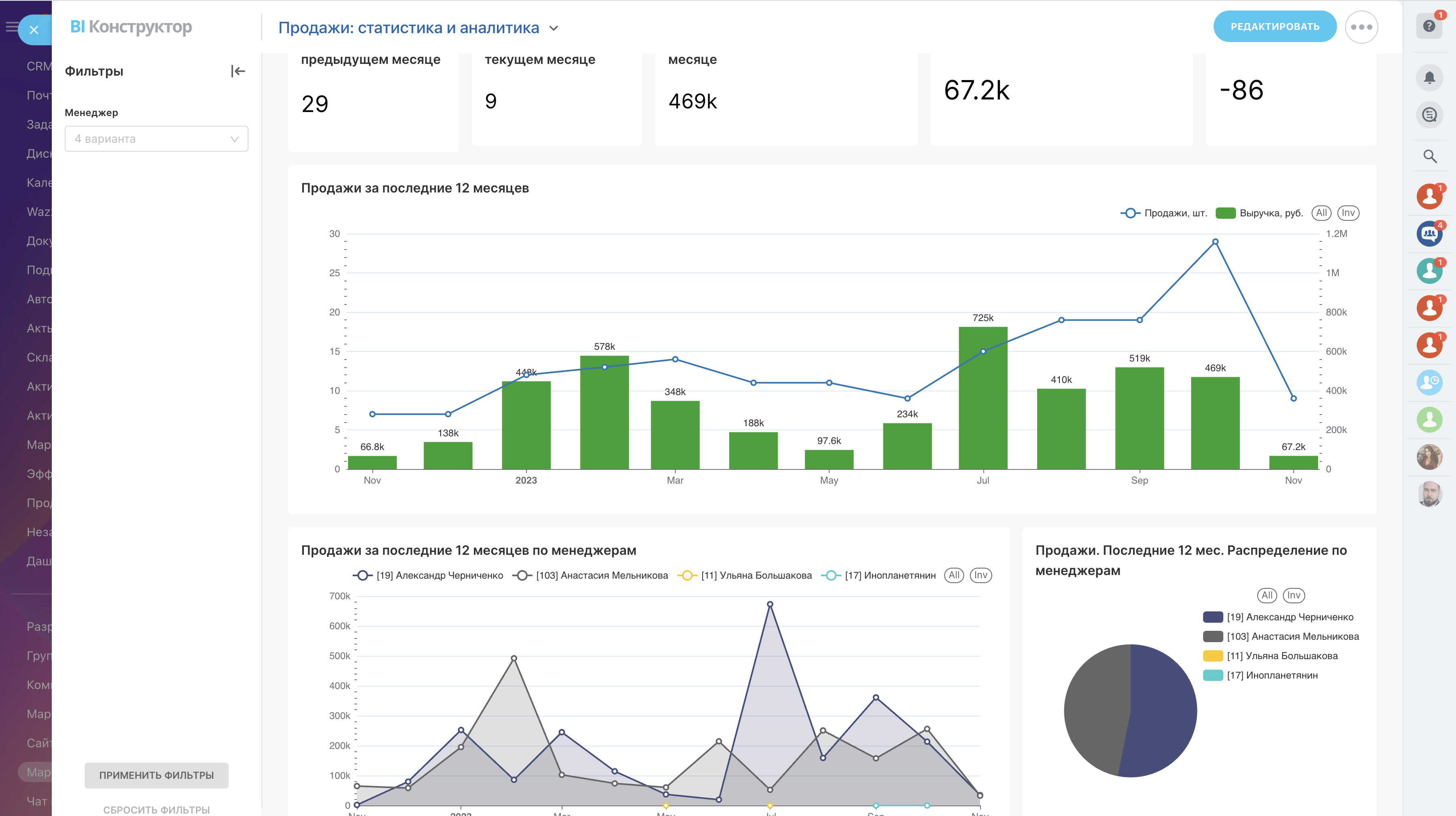 Отчет представляет собой детальный аналитический дашборд, который позволяет оценить эффективность продаж, отслеживать ключевые показатели и анализировать данные о продажах в режиме реального времени. Включает в себя информацию о продажах по периодам, по продуктам или услугам, по сотрудникам и по клиентам.