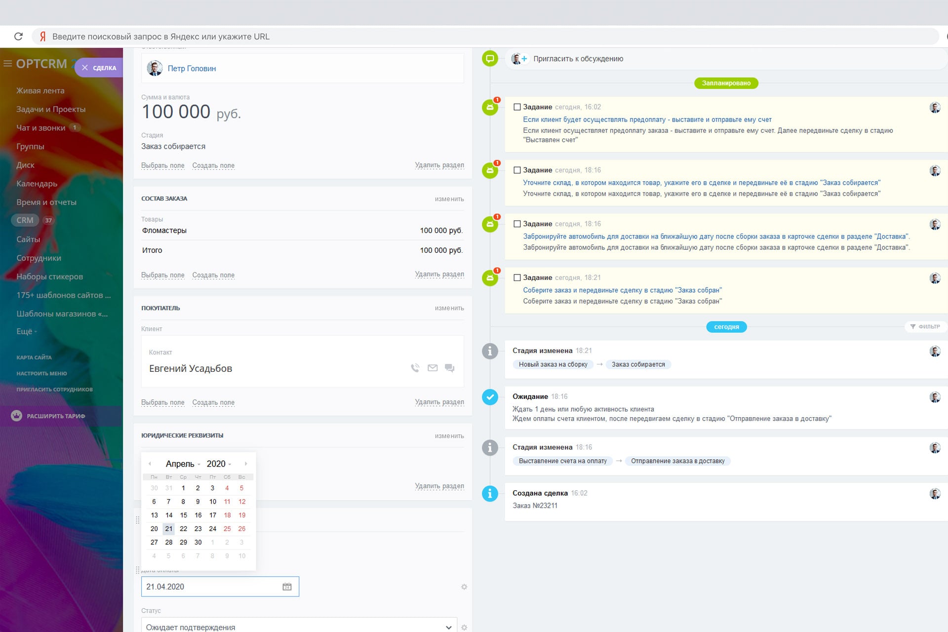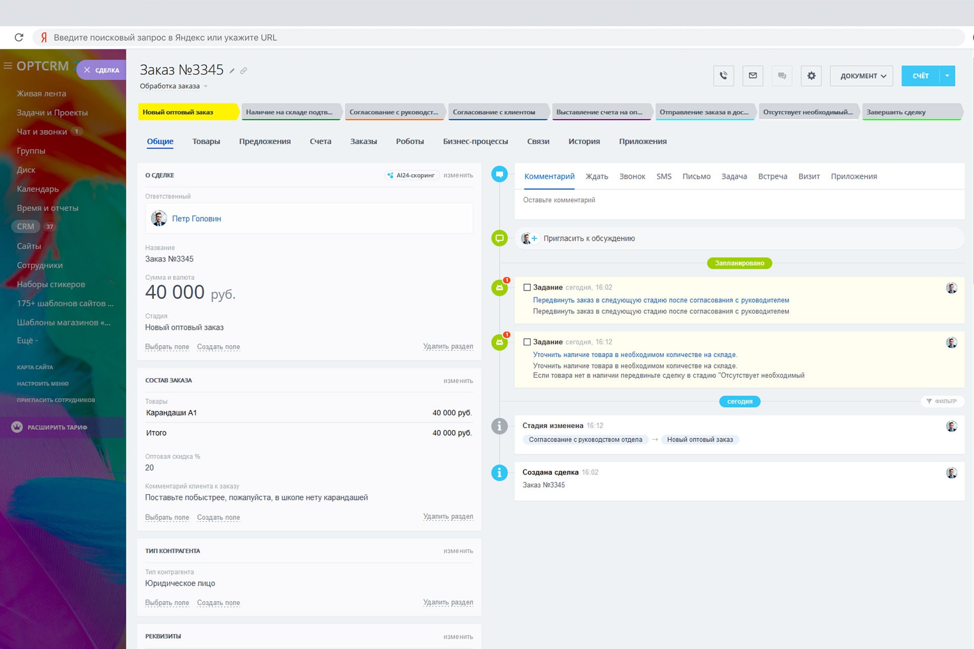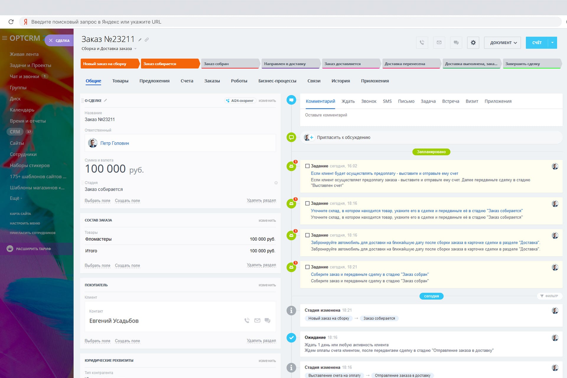 В отраслевой CRM уже создан и настроен заранее спланированный алгоритм обработки сделок, который запускается когда сделка перешла в нужную стадию.
