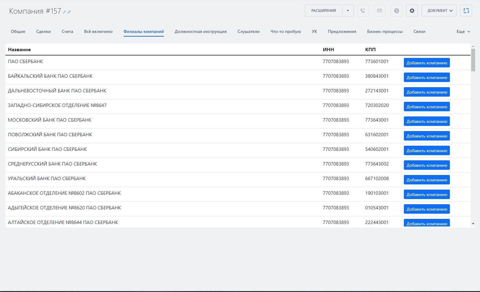 Поиск с контролем дубликатов по CRM, заполнение и создание реквизитов и филиалов компаний по ИНН и КПП из карточки сделки и компании.
