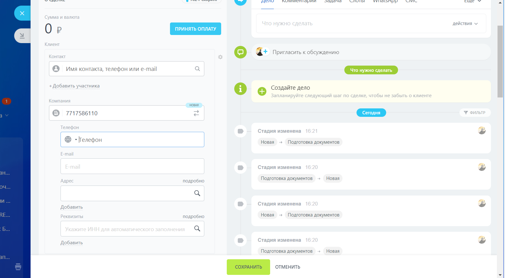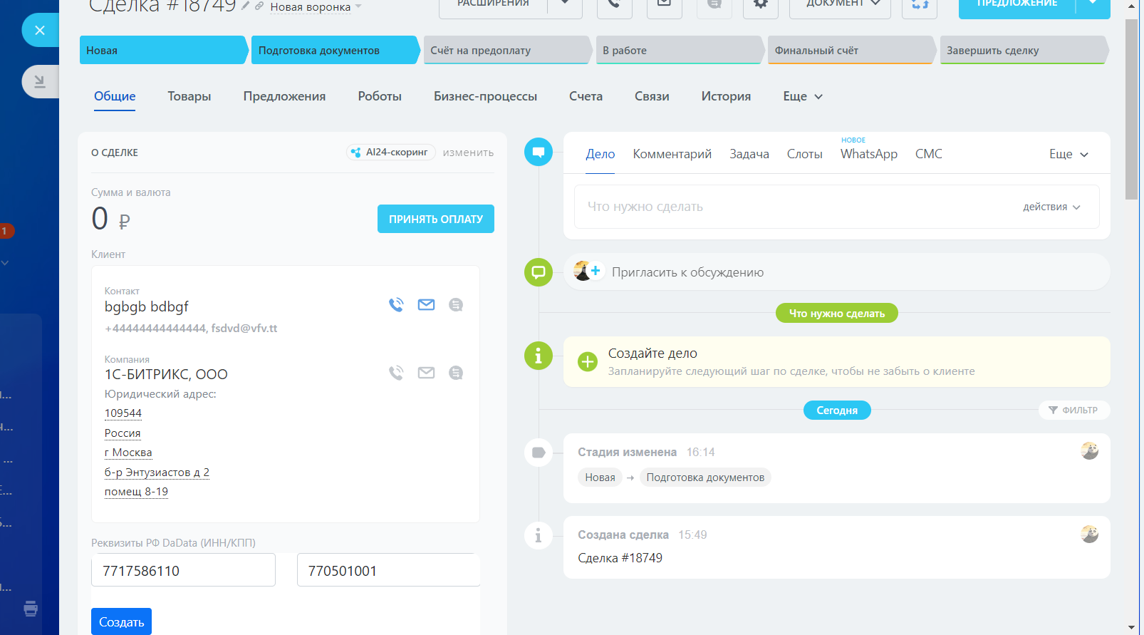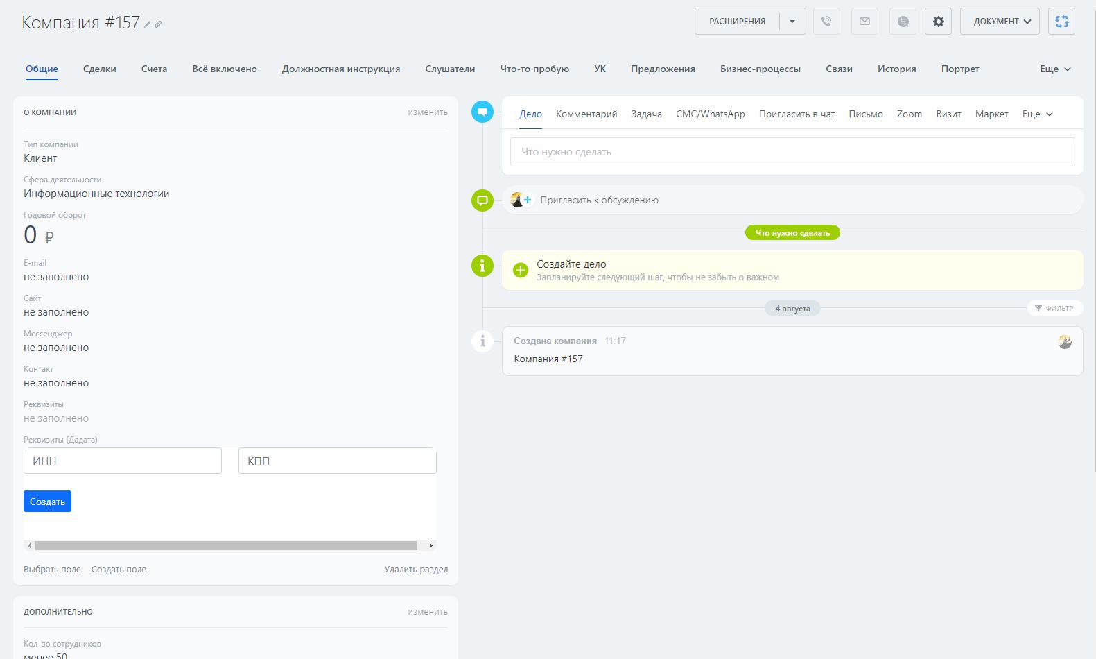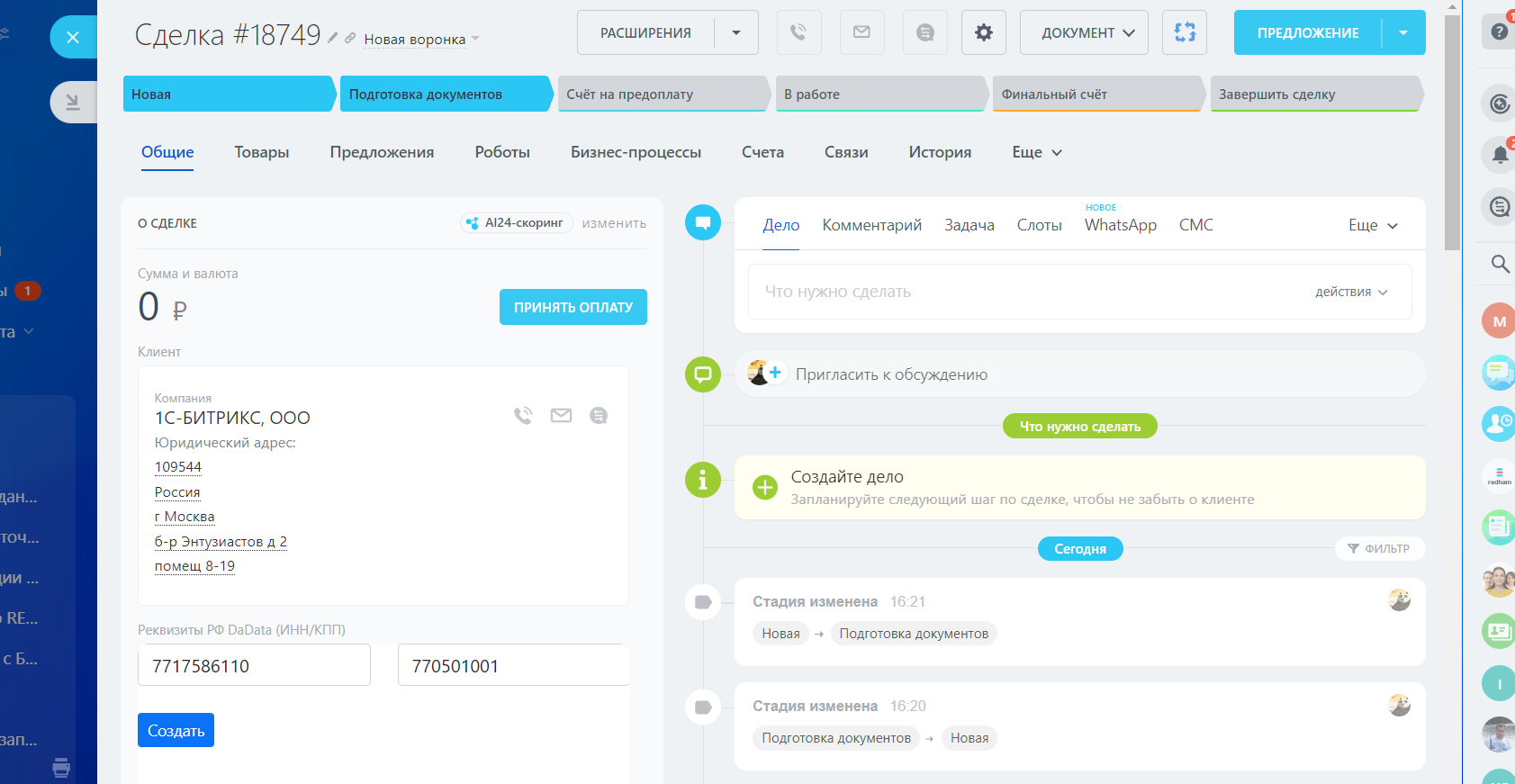 - если компания не указана в карточке сделки - создадим карточку с реквизитами, название карточки будет содержать наименование компании