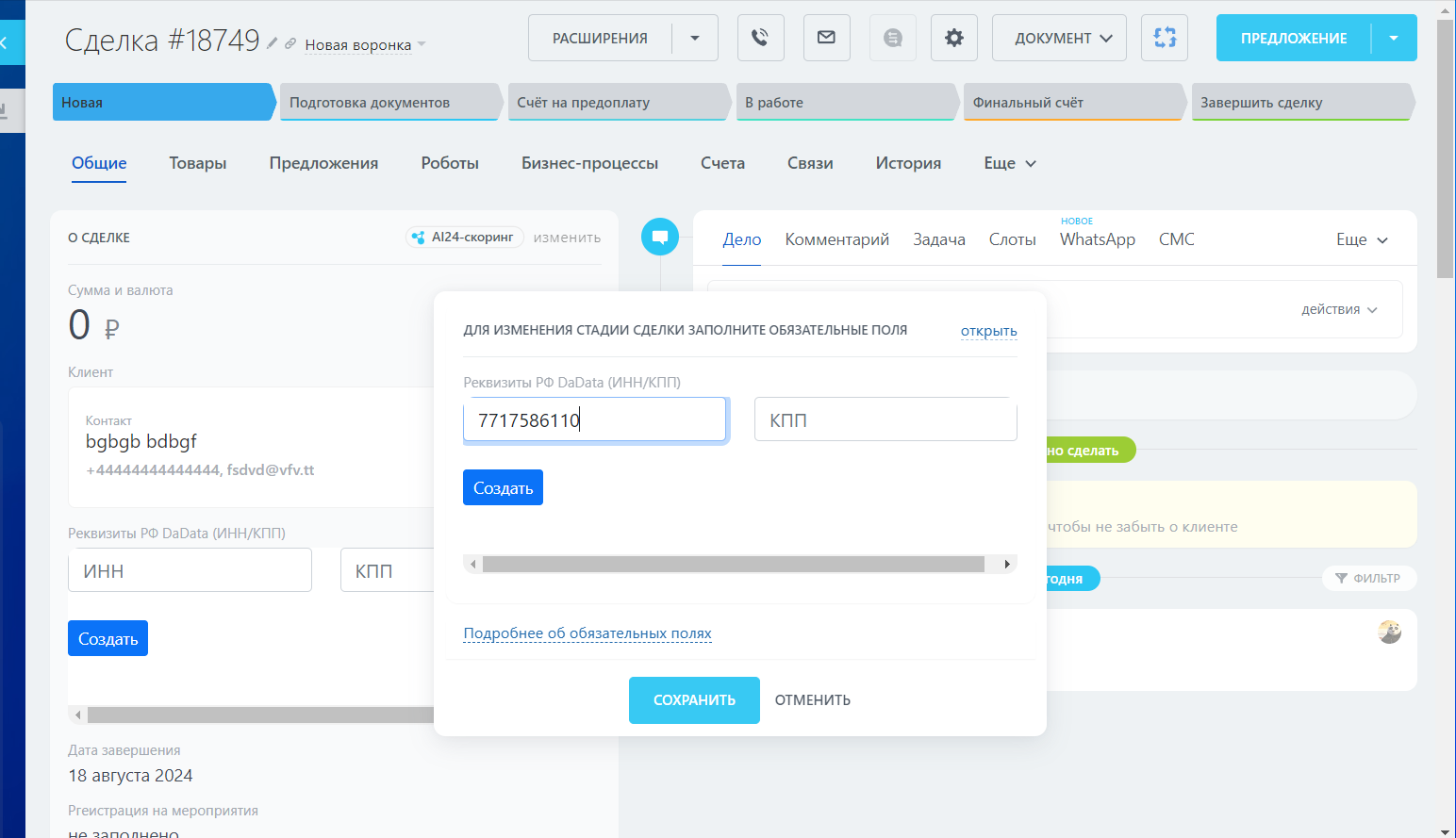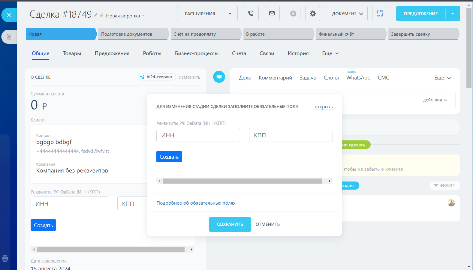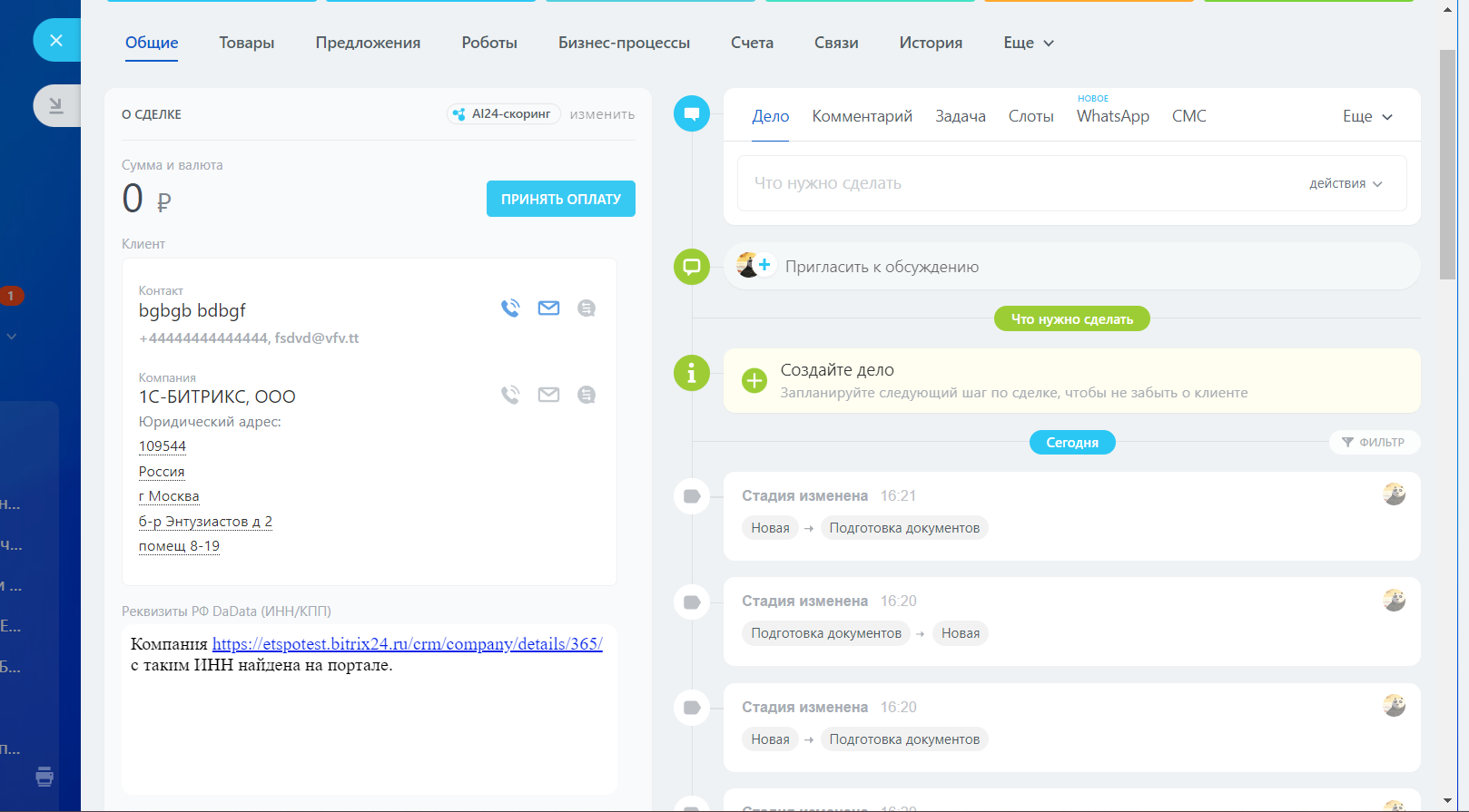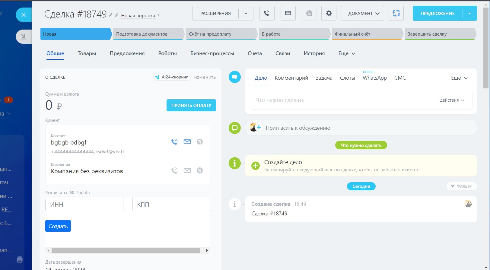 - если компания не указана в карточке сделки - создадим карточку с реквизитами, название карточки будет содержать наименование компании