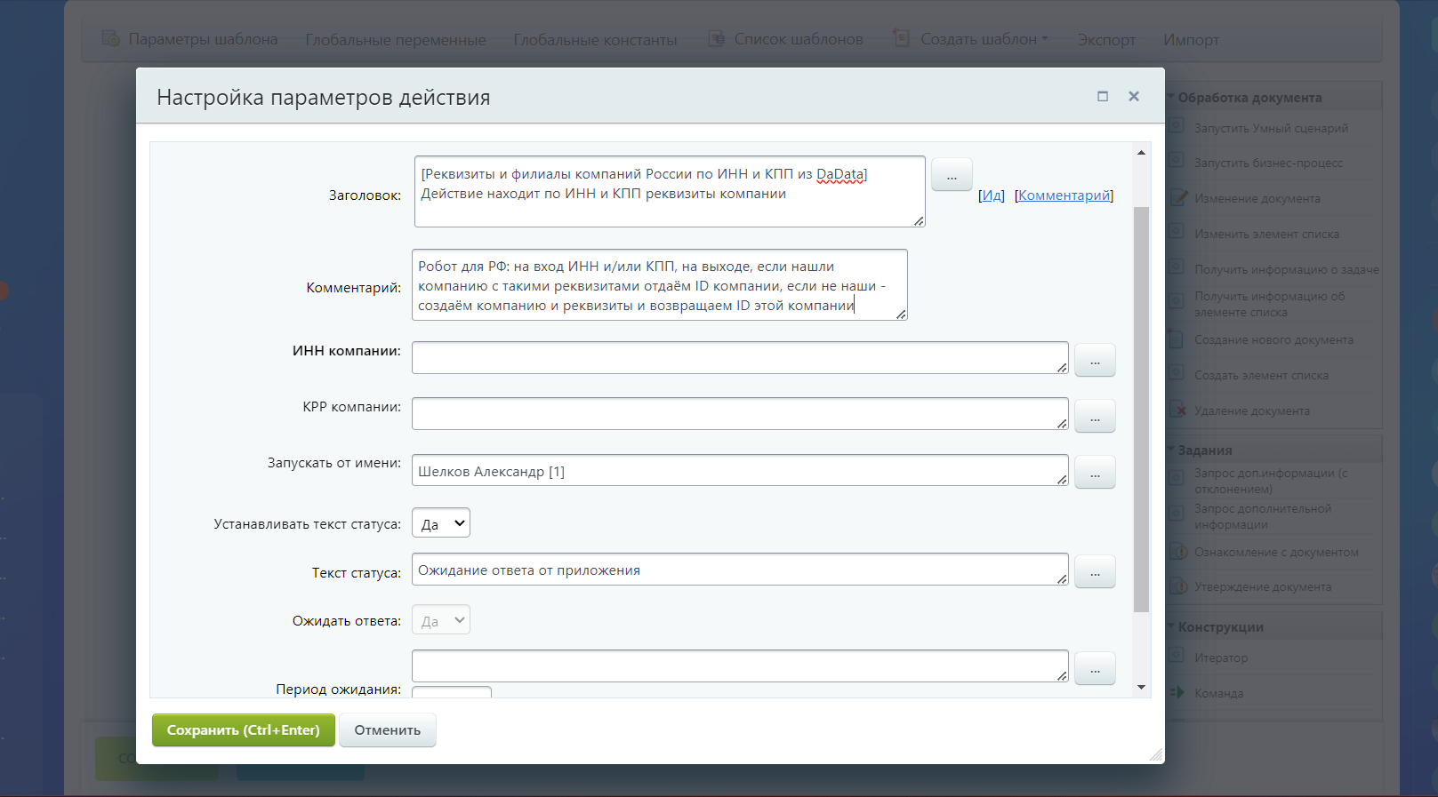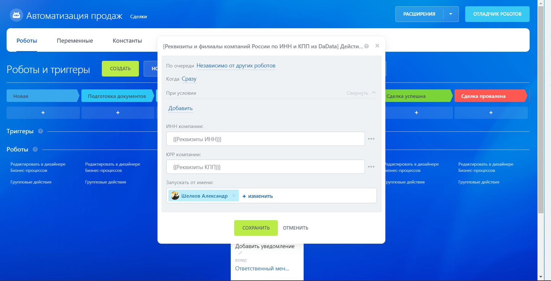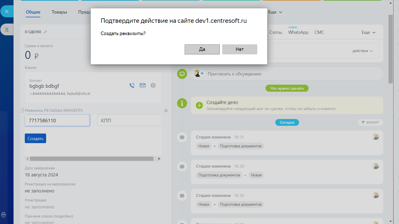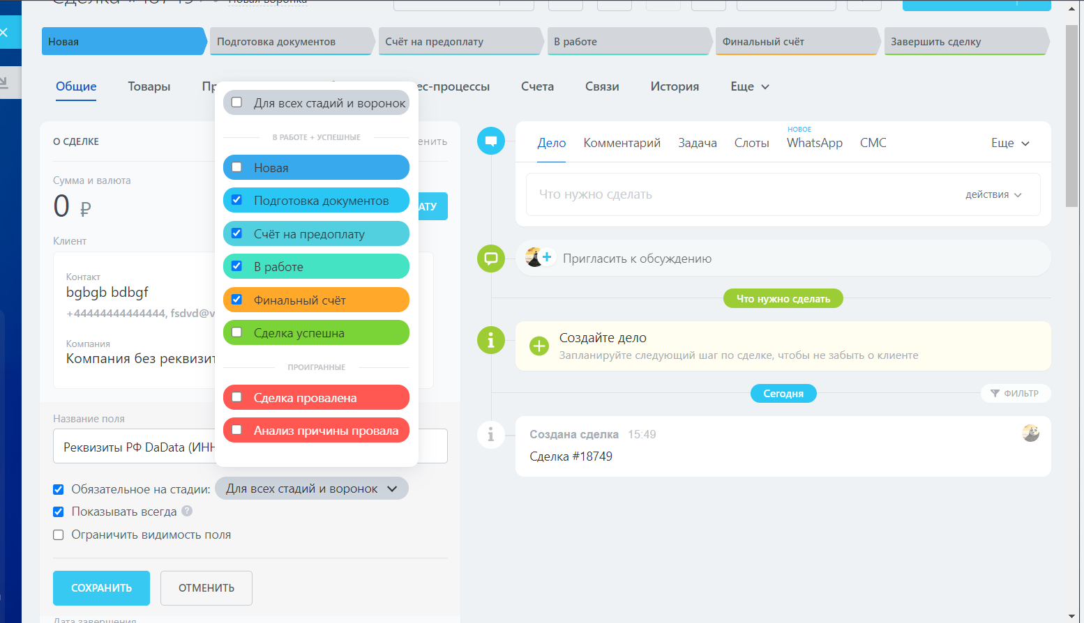 - если компания не указана в карточке сделки - создадим карточку с реквизитами, название карточки будет содержать наименование компании