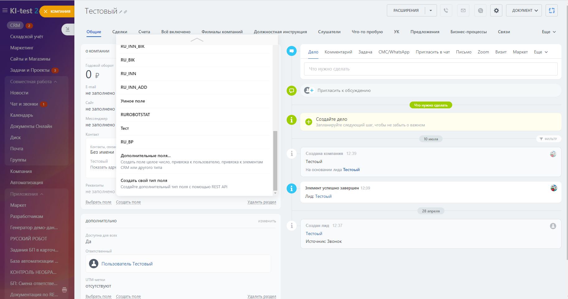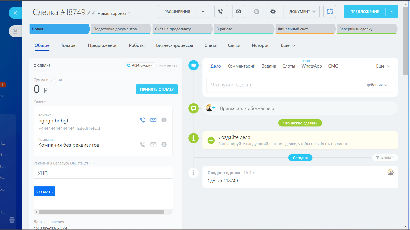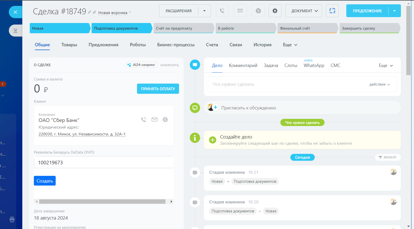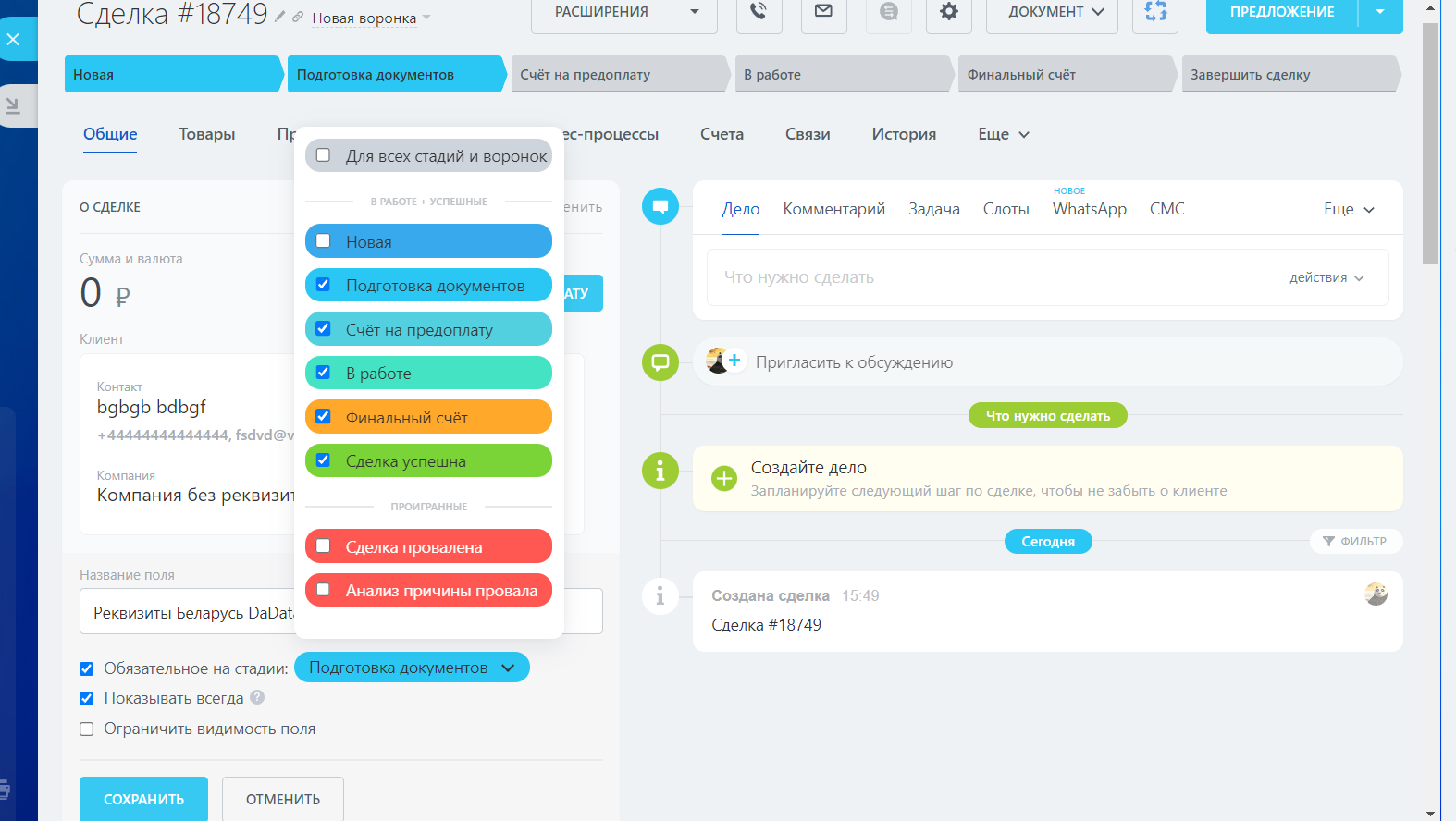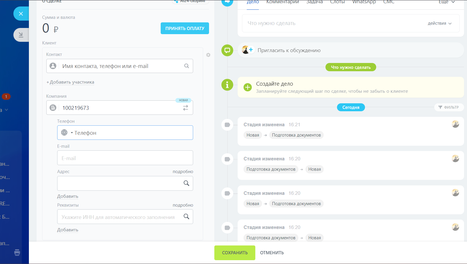 - если компания не указана в карточке сделки - создадим карточку с реквизитами, название карточки будет содержать наименование компании
