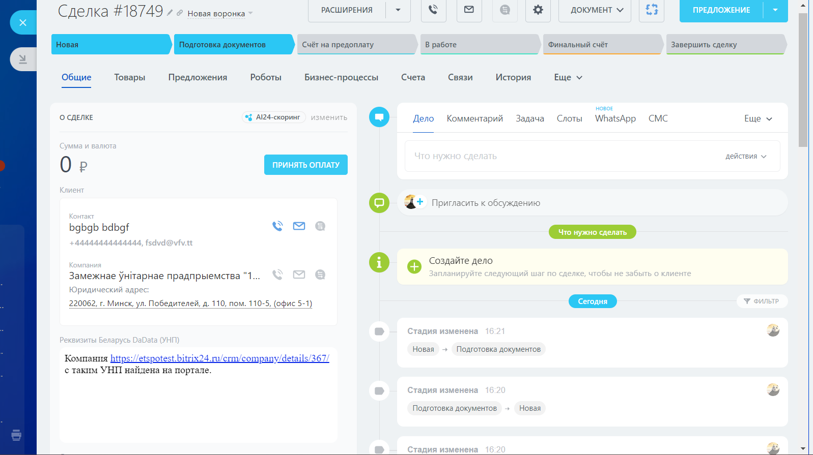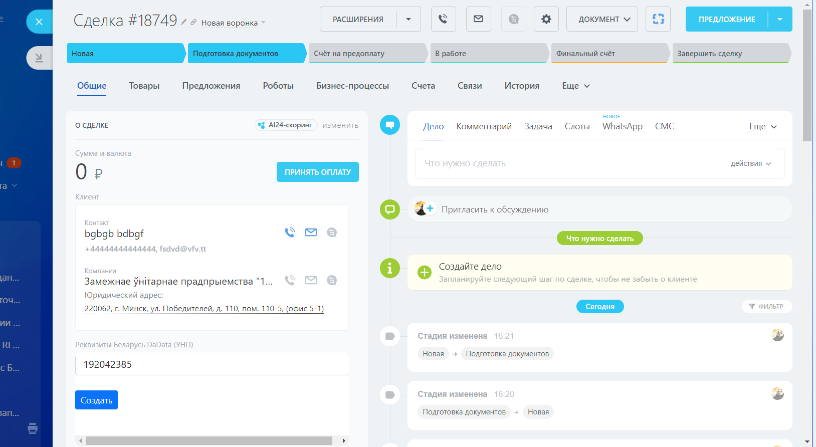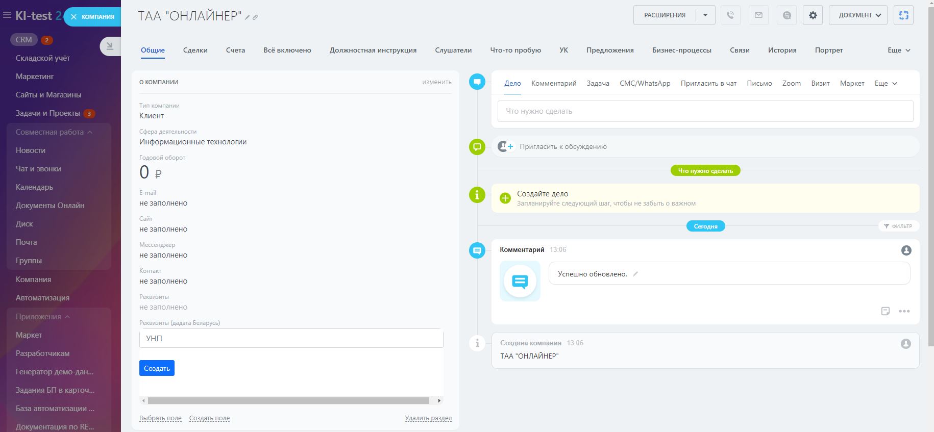 Обновление от 27.03.2024 г.: поддержали сценарий создания компании и реквизитов по УНП в карточке сделки, с переименованием созданной карточки компании и проверкой на дубликат по имеющимся реквизитам компании в CRM
