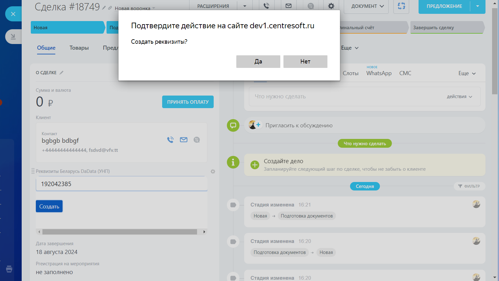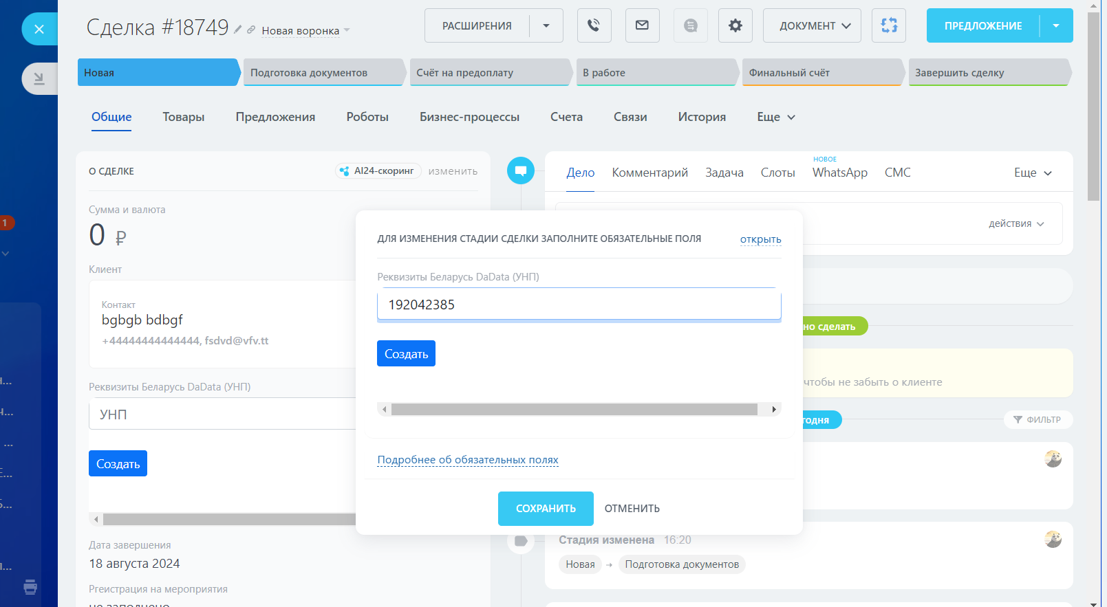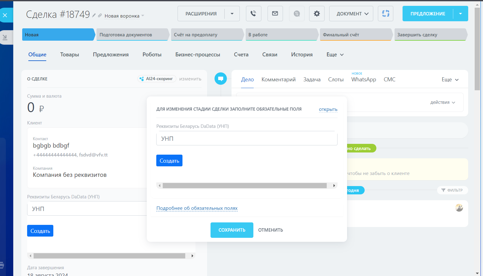 Обновление от 22.07.2024 г.: поддержали обязательность от стадии сделки для заполнения УНП (реквизитов) в сделке