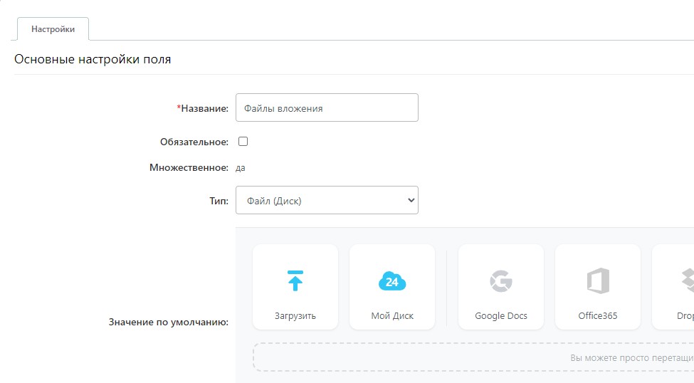 5. В Списках создать поле Файл вложения в «Основных настройки поля» указать тип поля «Файл (Диск)», в него будет происходить сохранение сгенерированного файла (Рисунок 5).