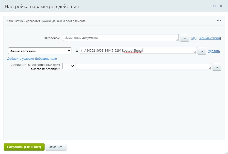 Г). В активити «Изменение документа» (Рисунок 13) необходимо сохранить сгенерированный файл в поле документа (Рисунок 14).
