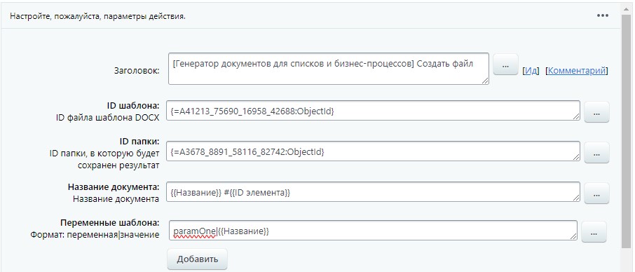 В поле «ID шаблона: ID файла шаблона DOCX» необходимо указать ID шаблона файла Диска (Рисунок 10).