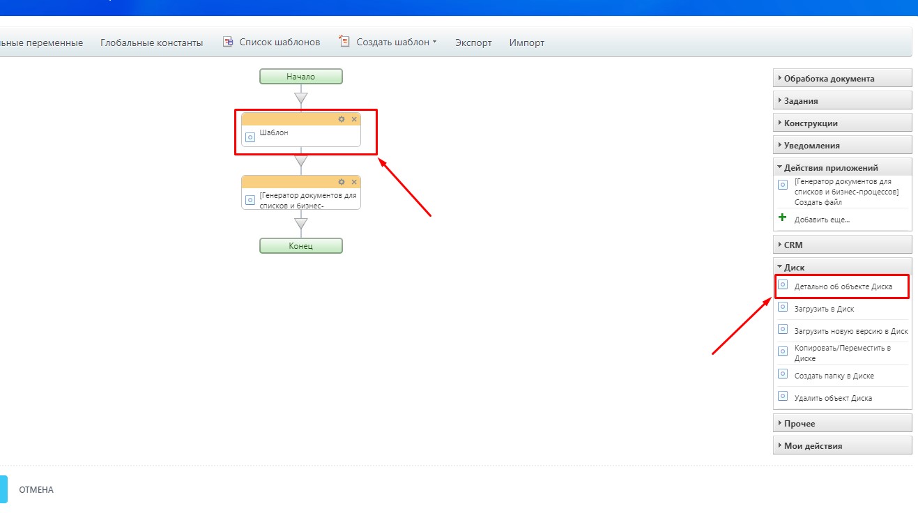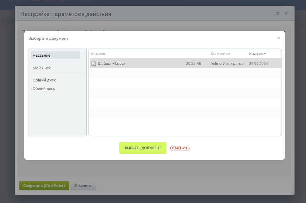 А). Детально об объекте Диска – в данном активити необходимо выбрать загруженный в Диск шаблон документа (файл) (Рисунок 7).
