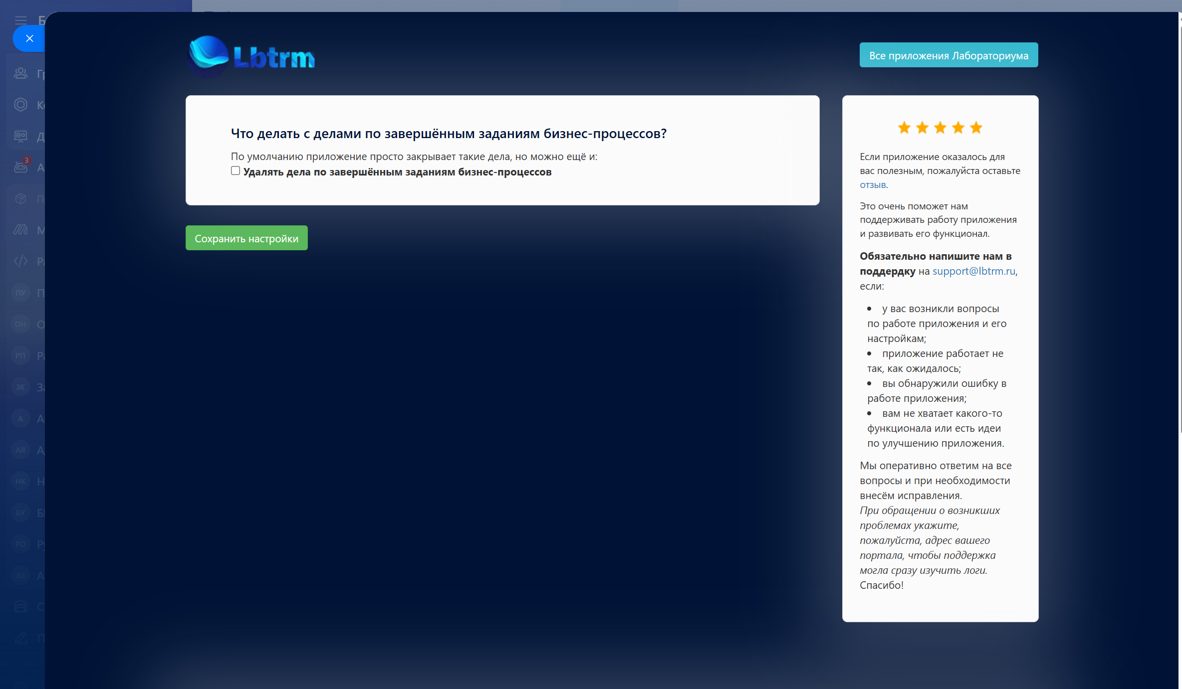 Если информация о бизнес-процессе в ленте вам нужна только во время выполнения процесса, а после завершения записи в ленте не нужны, то в настройках приложения можно включить опцию, при которой приложение будет не завершать, а сразу удалять дела из ленты.