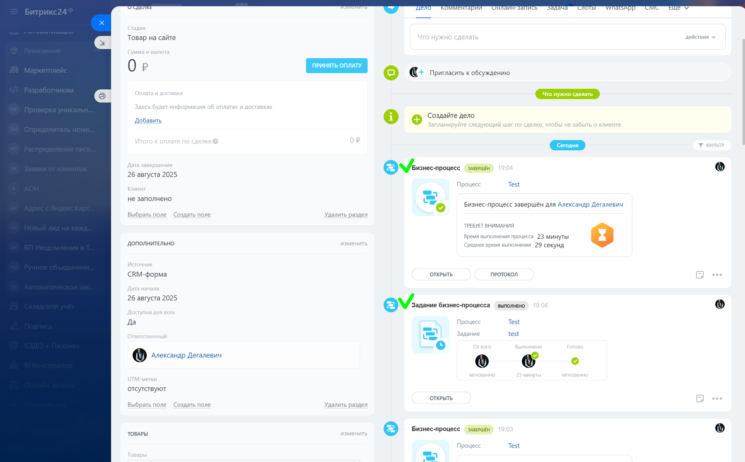 Автоматически завершает дела бизнес-процессов после выполнения заданий или завершения бизнес-процессов. Помогает поддерживать порядок и актуализировать информацию в ленте элементов CRM.