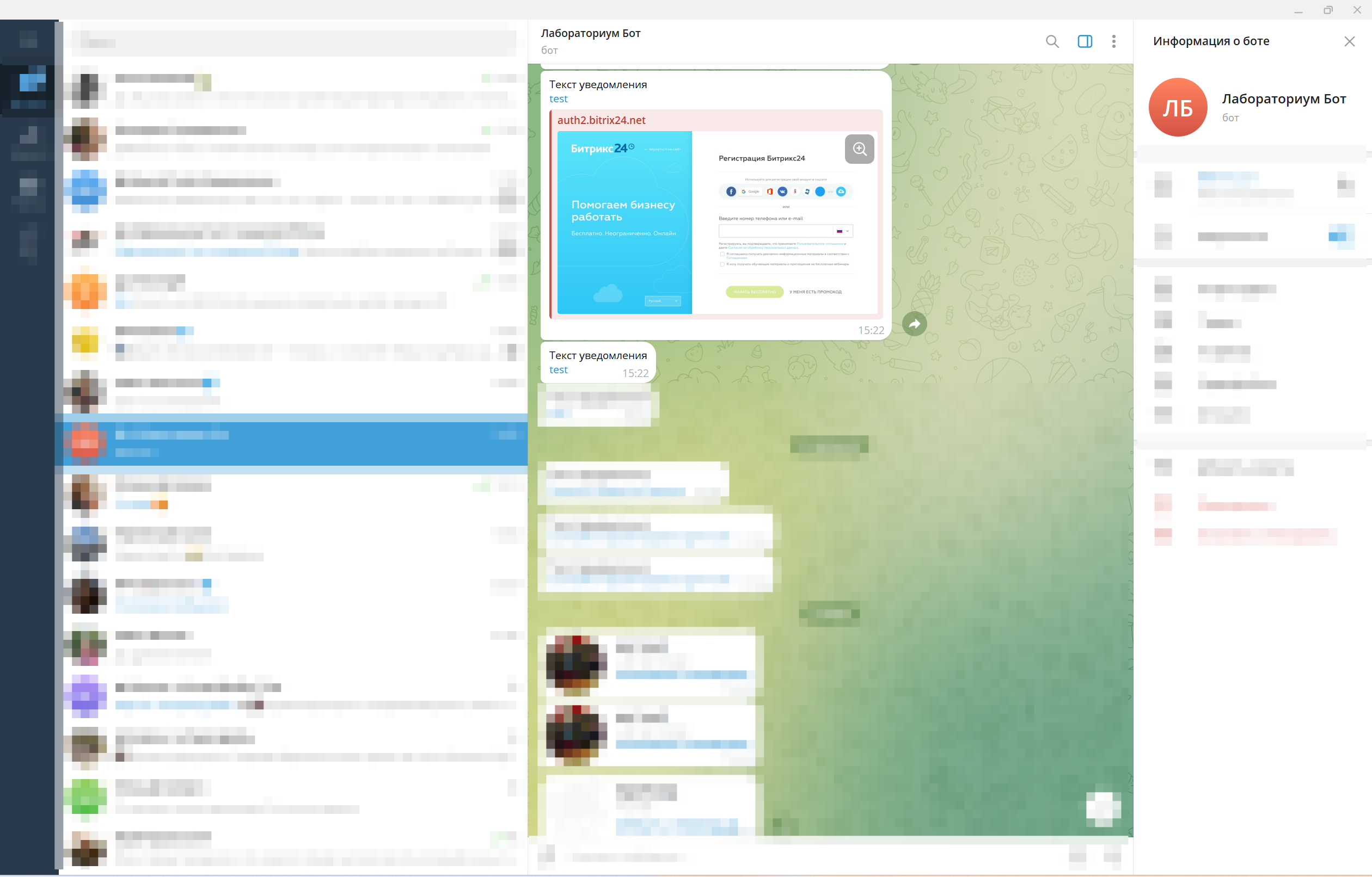 Удобно так же, что можно подключить несколько ботов и отправлять сотрудникам и клиентам уведомления от имени разных ботов