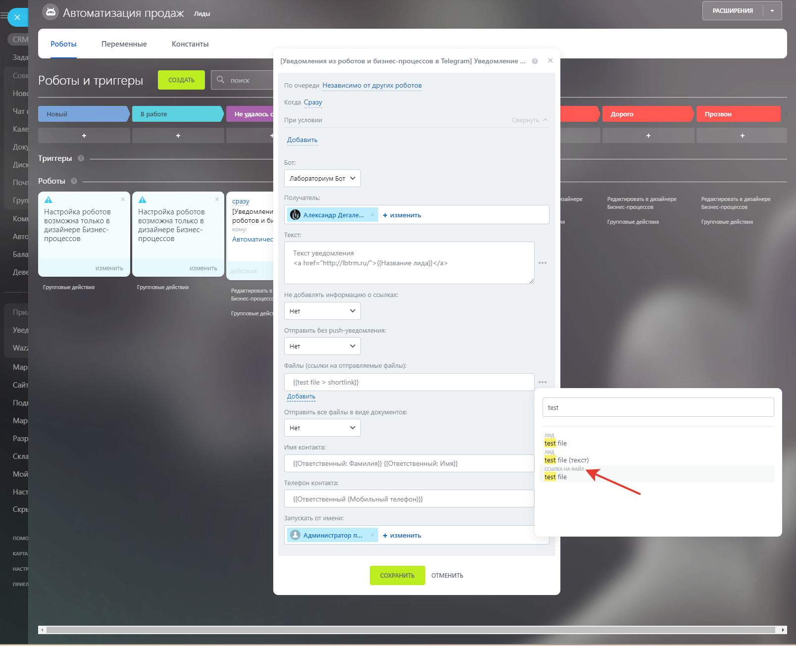 В профиле сотрудников появится поле для Telegram ID. Заполнив это поле вы сможете отправлять сообщения сотрудникам в Telegram, как обычные уведомления, указывая в настройках робота роль сотрудника (например, ответственного за лид), отдел или группу.