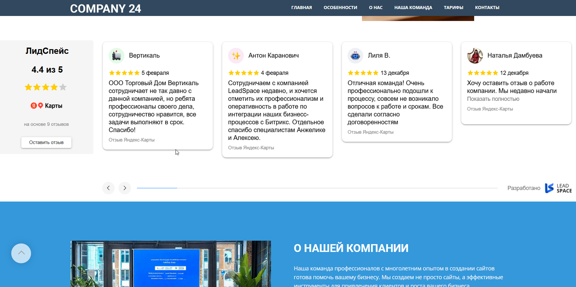 Что делает приложениеПриложение добавляет в конструктор сайтов Bitrix24 готовый блок для отображения отзывов о вашей компании с Яндекс.Карт. Блок автоматически загружает актуальные отзывы, рейтинг компании и количество оценок, отображая их в удобном слайдере с возможностью навигации.
