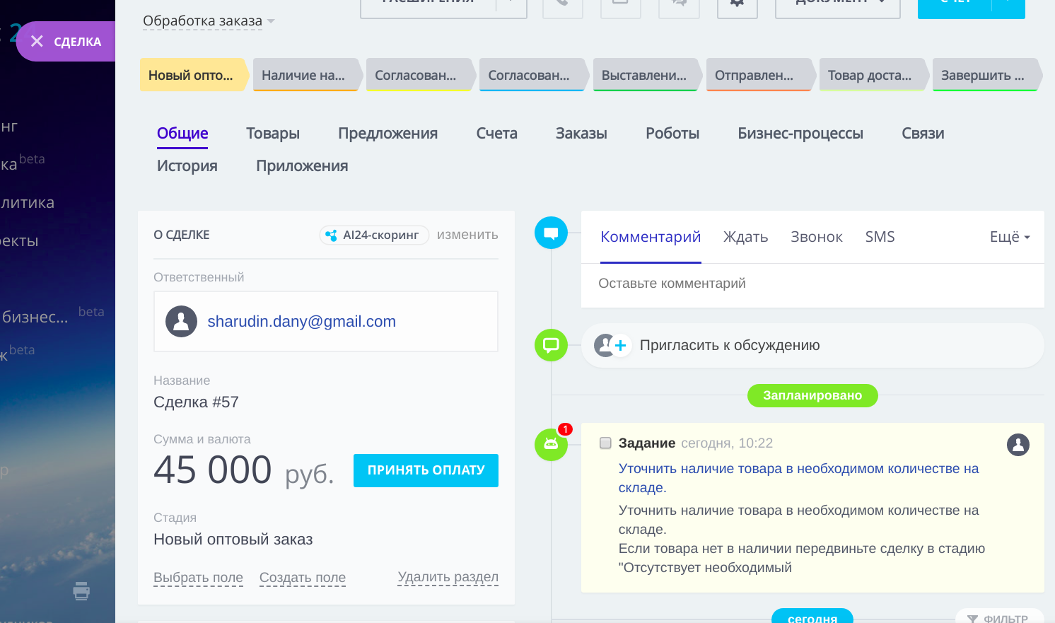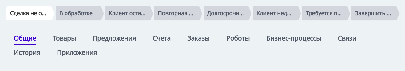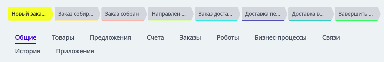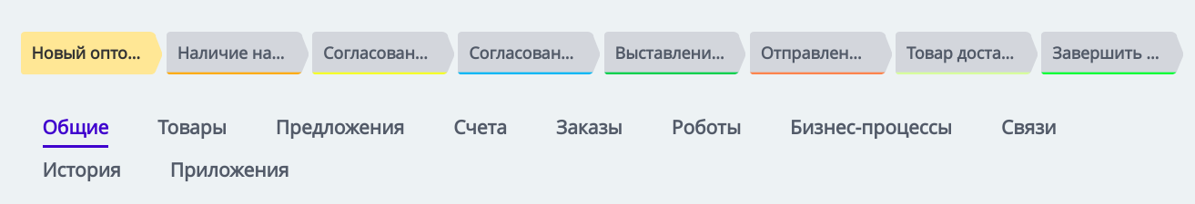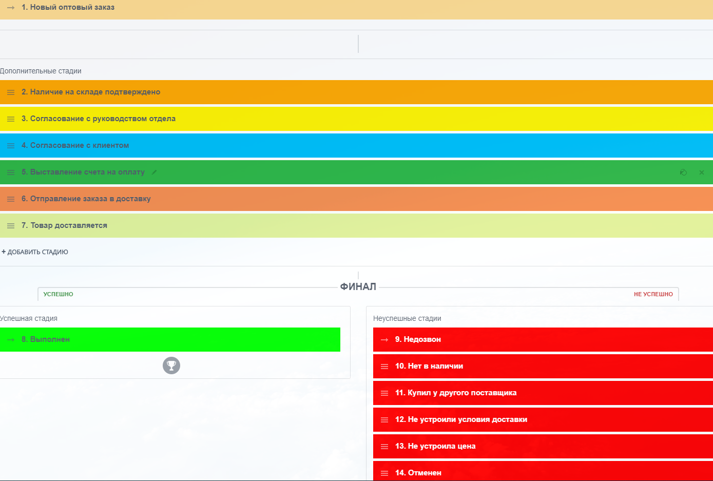 Направление Обработка заказа содержит следующие стадии: Новый оптовый заказ, Наличие на складе подтверждено, Согласование с руководством отдела, Согласование с клиентом, Выставление счета на оплату, Отправление заказа в доставку, Товар доставляется.