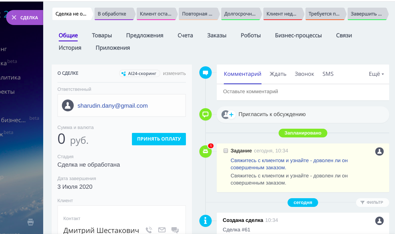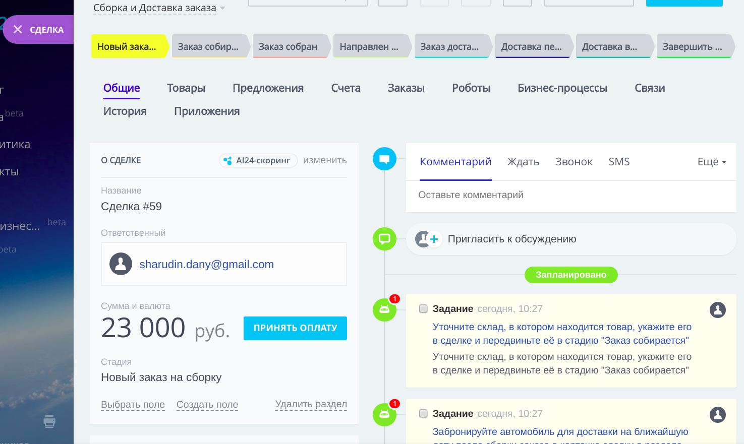 Карточка сделки направлений Обработка заказа и Сборка и доставка заказа содержит такие разделы и поля как: Информация о доставке, Дополнительная информация (Тип сделки, Бронирование автомобиля для доставки, Комментарий клиента к заказу, Оптовая скидка %).Карточка сделки направления Постпродажное сотрудничество содержит такие разделы полей как: Информация о складе, Информация о бронировании, Информация о доставке, Информация об оплате, Состав заказа.