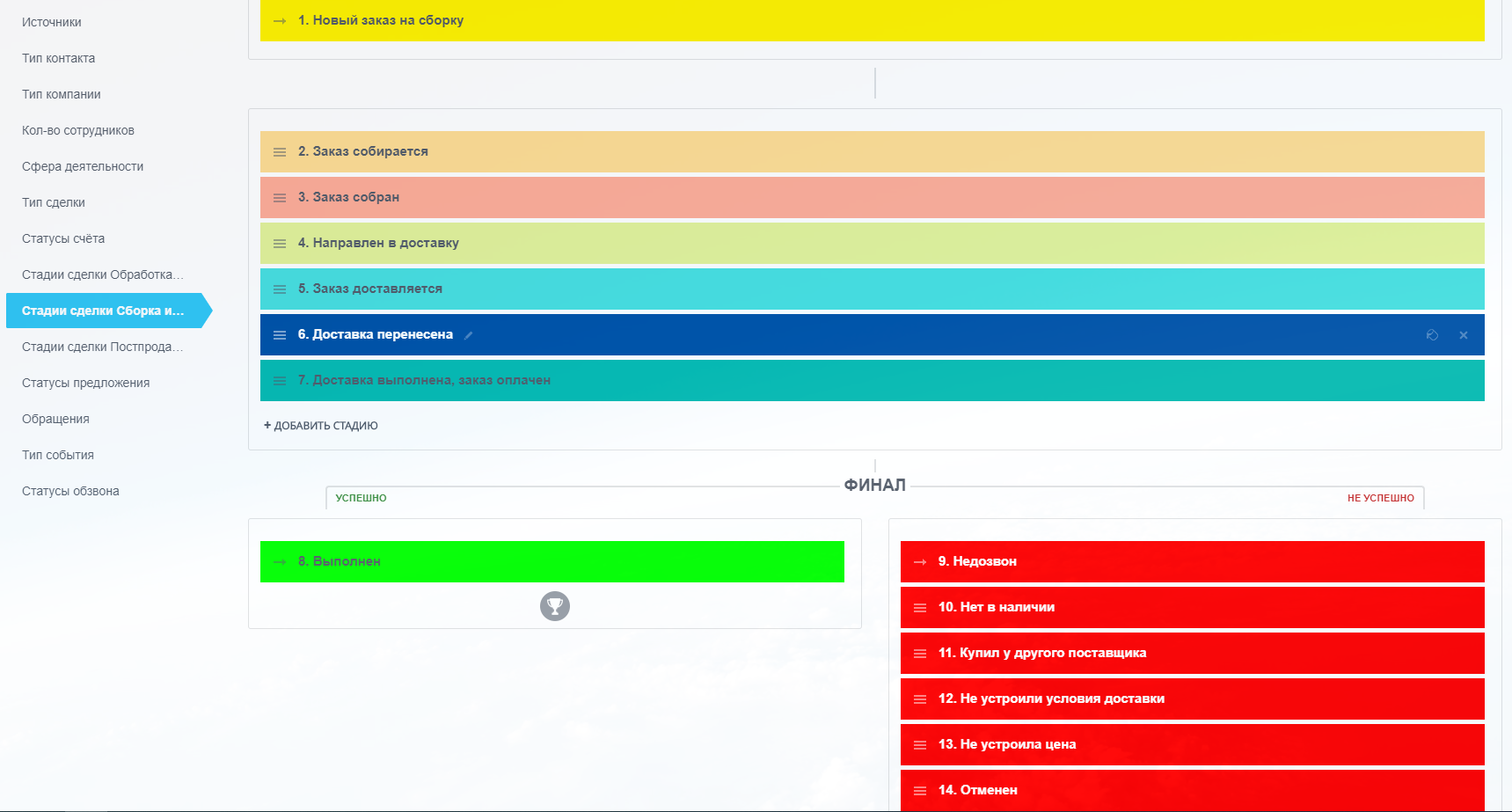 Направление Сборка и доставка заказа содержит: Новый заказ на сборку, Заказ собирается, Заказ собран, Направлен в доставку, Заказ доставляется, Доставка перенесена, Доставка выполнена, Заказ оплачен.