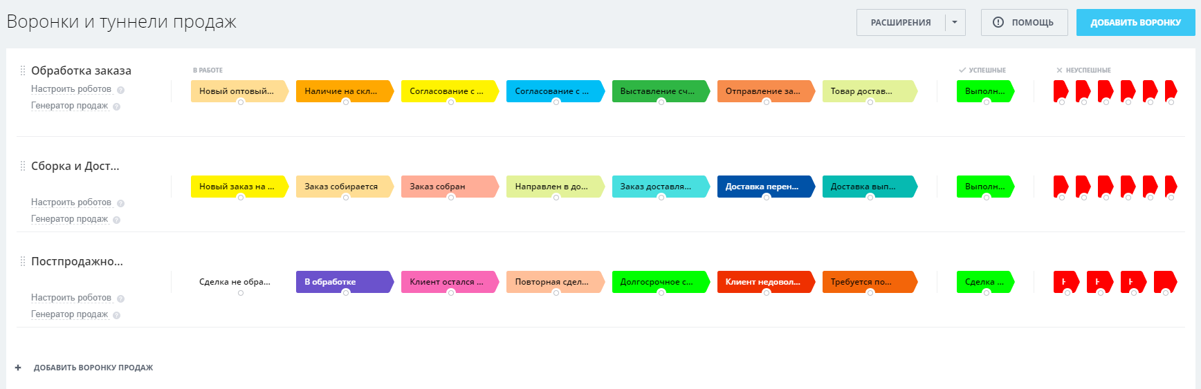 Настроены три воронки, с роботами и триггерами необходимыми для максимально комфортной работы в интернет-опте. Данное решение содержит три воронки, роботов привязанных к воронкам, а также раздел специализированных полей (таких как Сегмент, Особые предпочтения), которые помогут менеджеру собрать всю необходимую информацию.