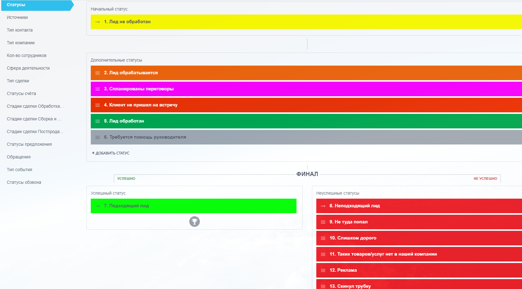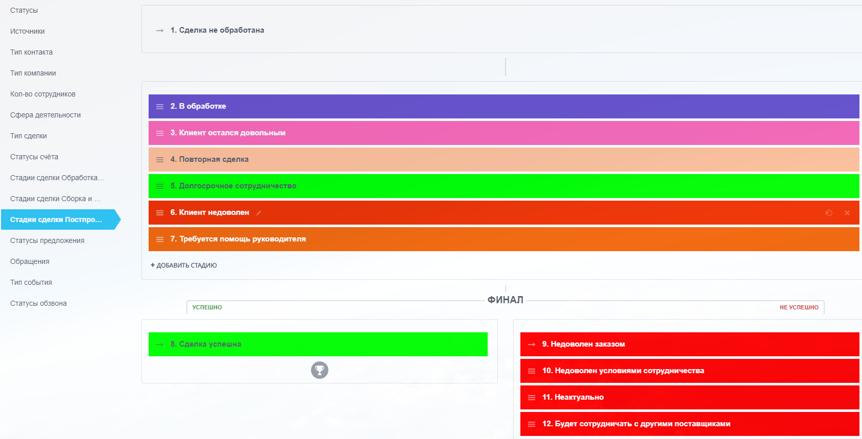Направление Постпродажное сотрудничество содержит: Сделка не обработана, В обработке, Клиент остался довольным, Повторная сделка, Долгосрочное сотрудничество.