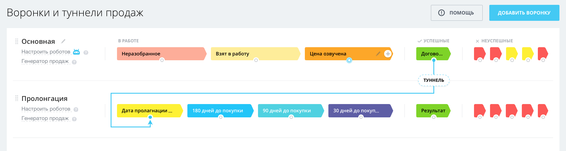 • Воронка «Пролонгация» - для автоматического ведения повторных продаж;