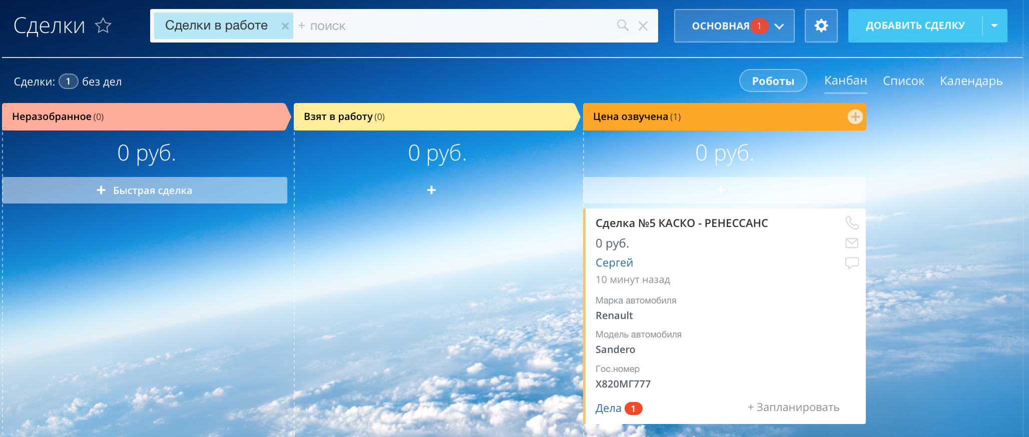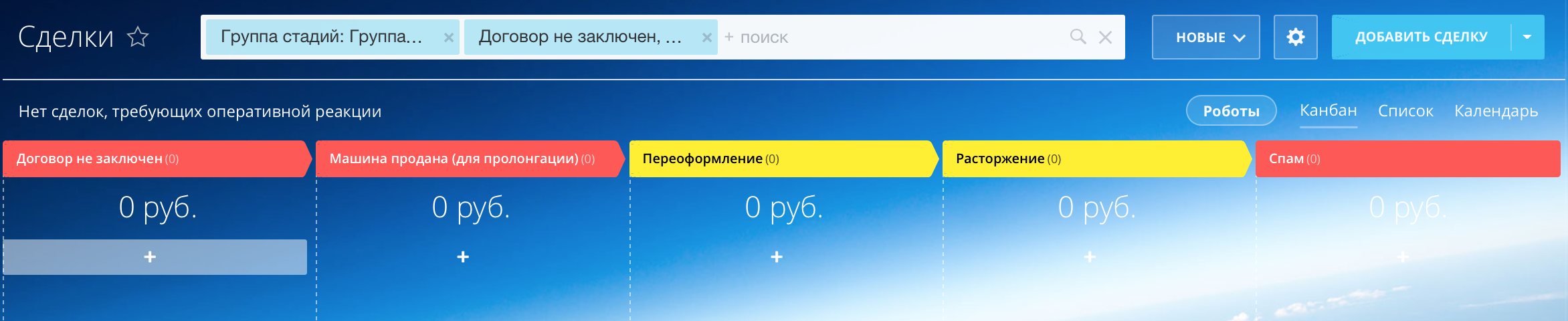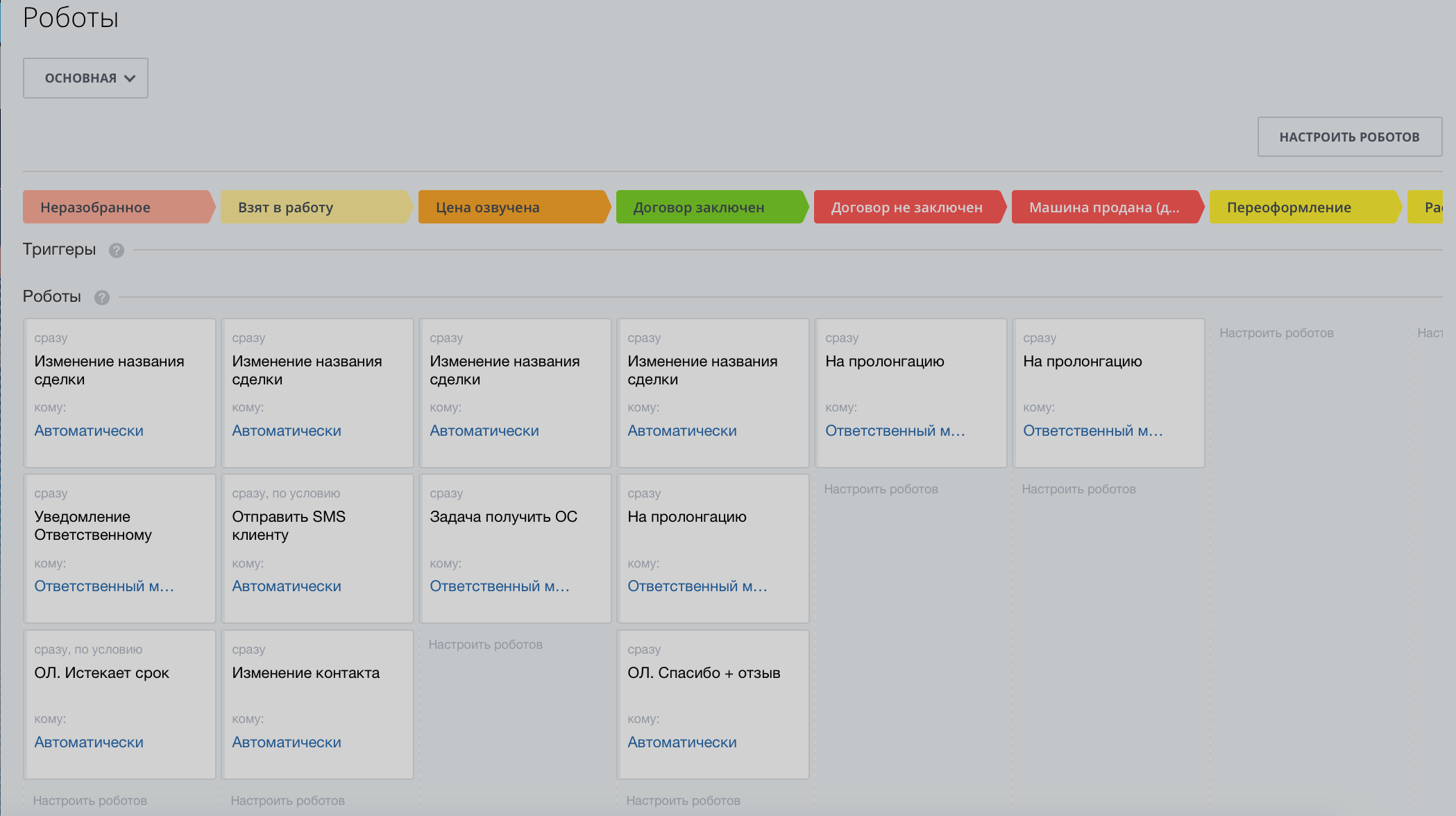 Воронка «Основная» содержит такие стадии, как Неразобранное, Взят в работу, Цена озвучена. А также успешная стадия «Договор заключен» и неуспешные стадии «Договор не заключен», «Машина продана (для пролонгации)», «Переоформление», «Расторжение» и «Спам».