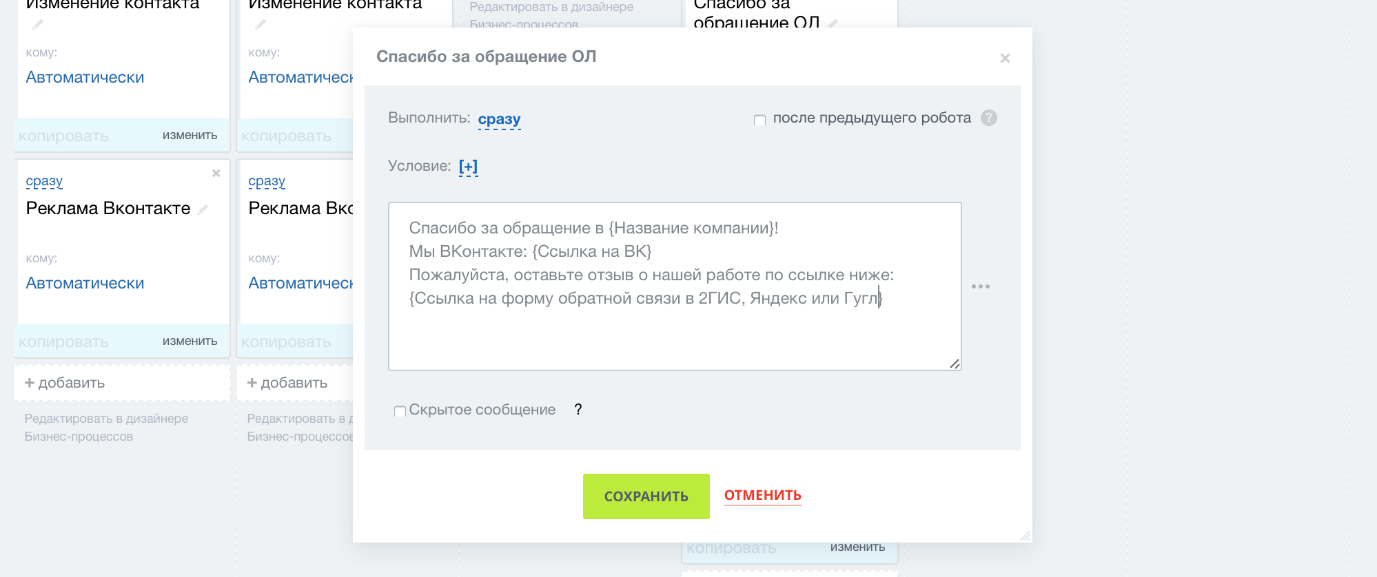 • Автоматическое сообщение клиенту с запросом обратной связи.