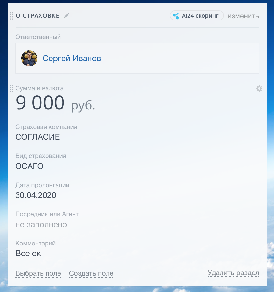 • Автоматическая смена названия сделок в формате «Сделка №{{ID}} {{Вид страхования}} - {{Страховая компания}}»;