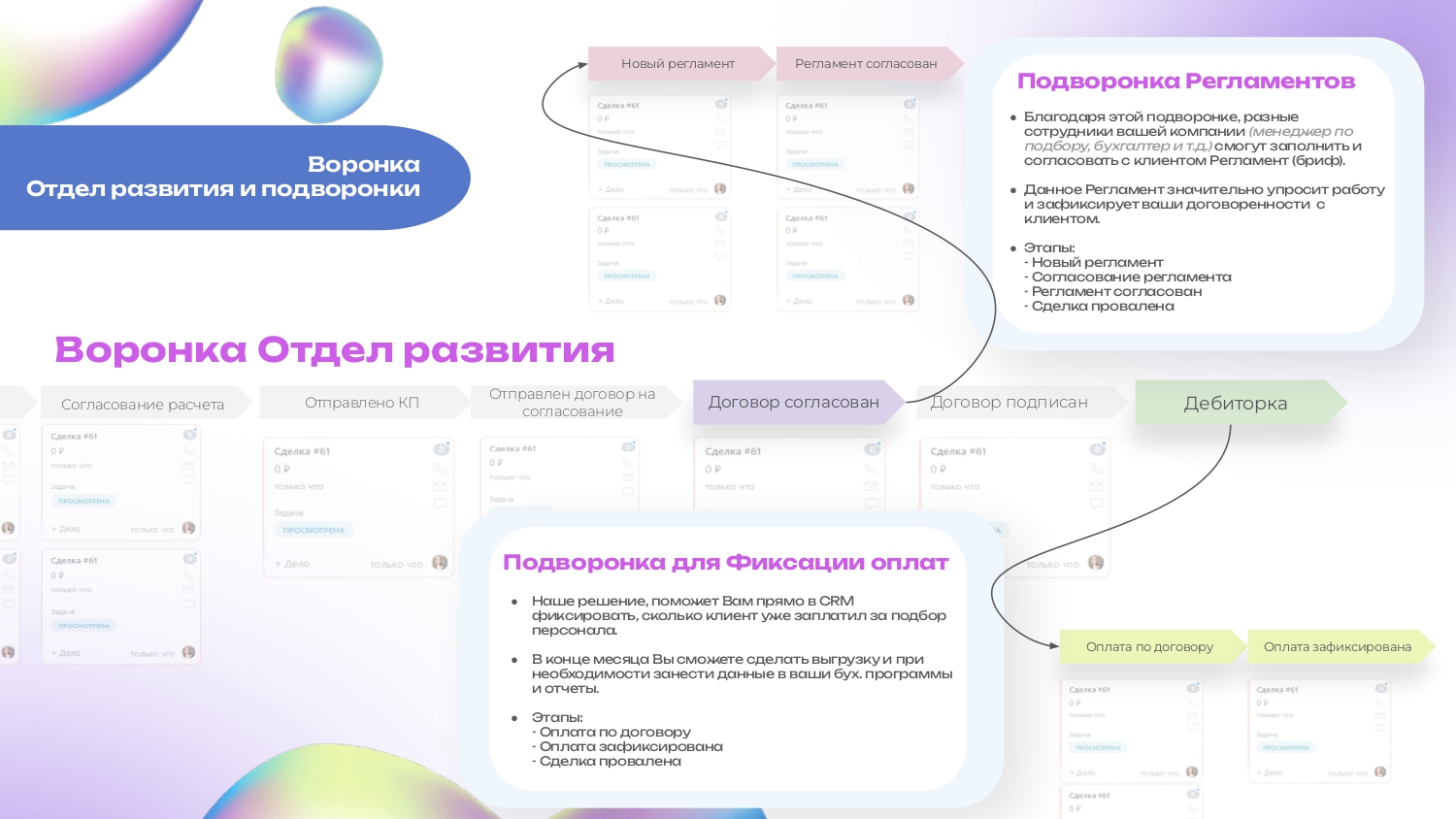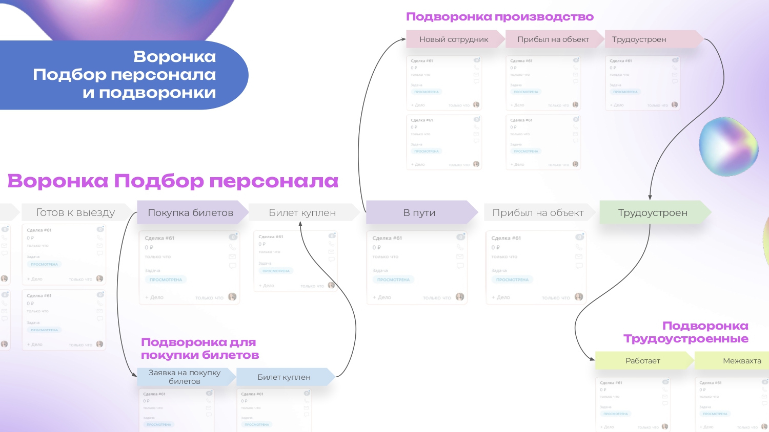 В решение есть 2 воронки: Отдел развития и Подбор персонала и несколько подворонок (подробная схема в изображениях).