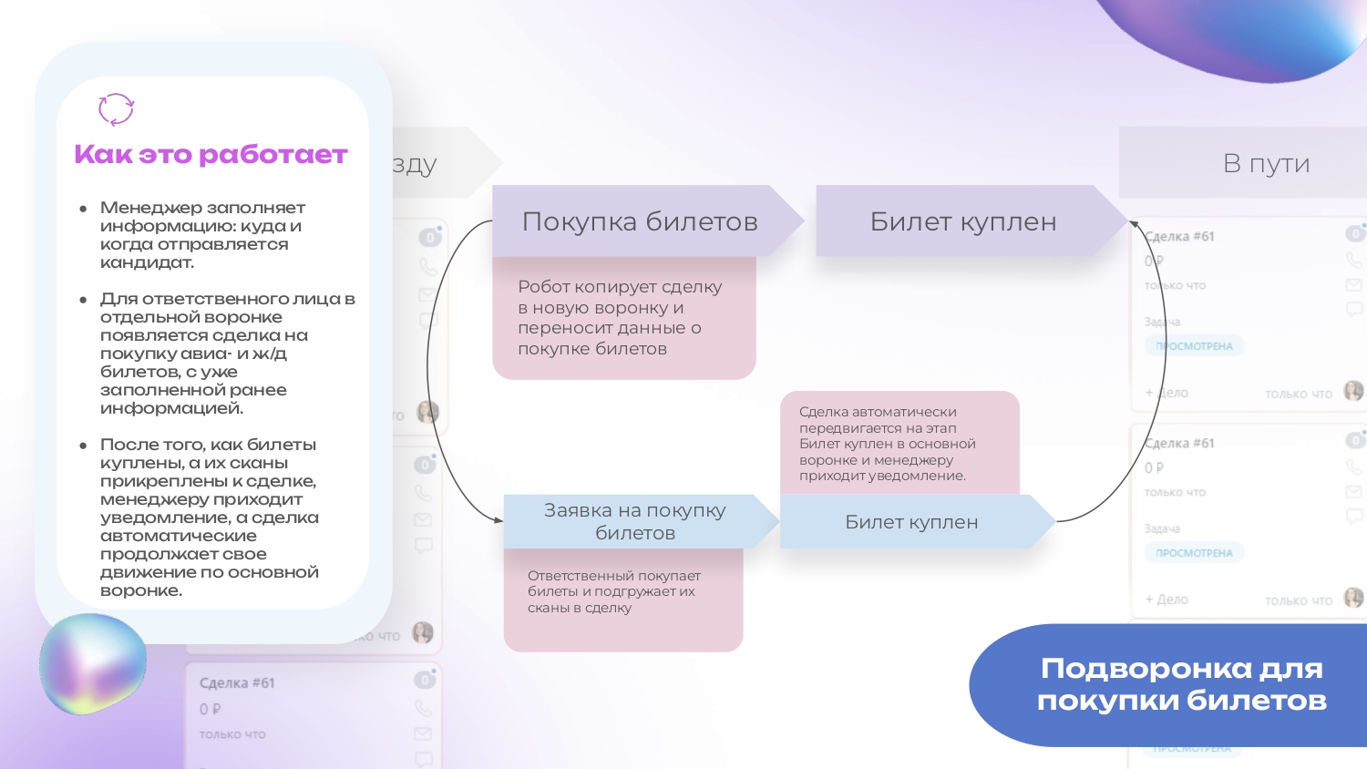 - Для ответственного лица в отдельной воронке появляется сделка на покупку авиа- и ж/д билетов, с уже заполненной ранее информацией.