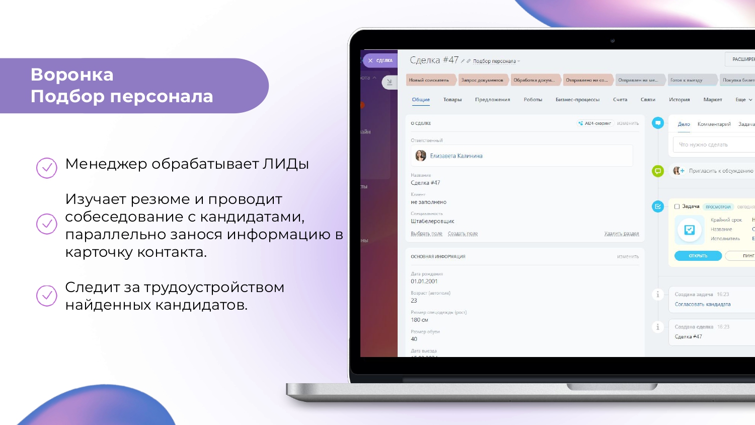 - Обрабатывает резюме и проводит собеседование с кандидатами, параллельно занося информацию в карточку контакта.