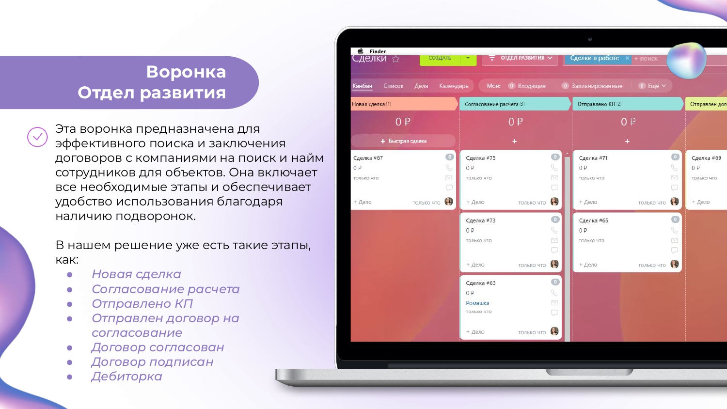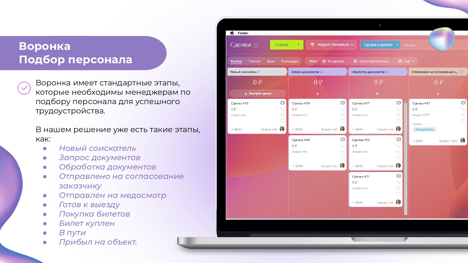 - После заключения договора, вы готовы начинать работу по поиску персонала в воронке Подбор персонала.