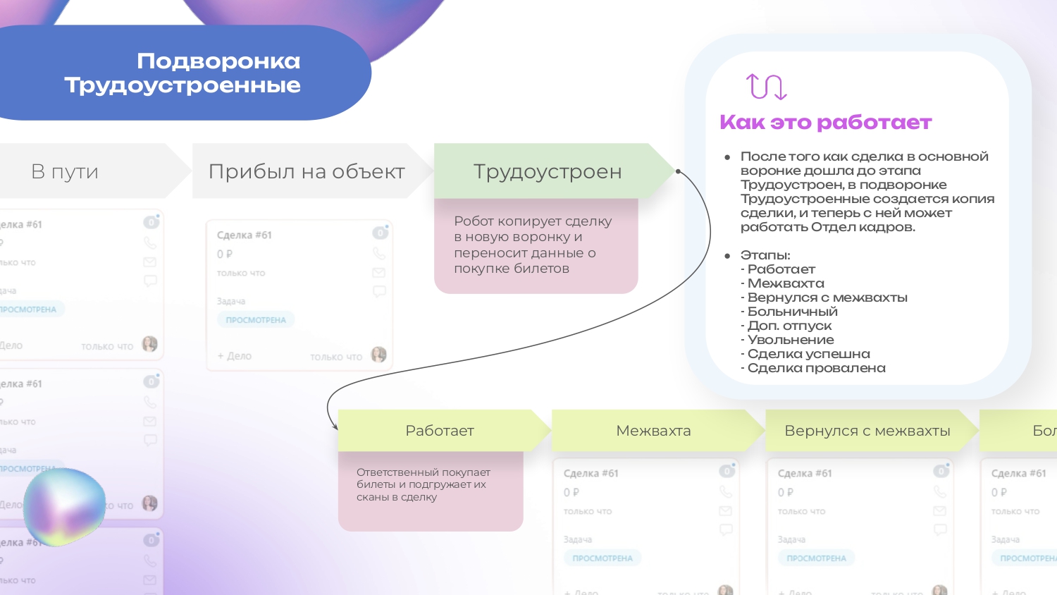 - После того, как трудоустроенный сотрудник отправляется в путь на объект работы, в подворонке для производства появляется новая сделка, которая позволяет контролировать сколько и какие сотрудники прибудет на производство.