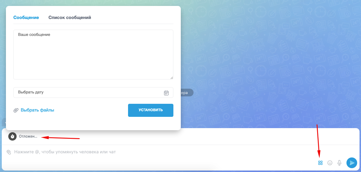 Чтобы использовать отложенные сообщения, необходимо установить приложение. После чего в чате нажать на соответствующую иконку. Установить нужные параметры для отправки сообщения. Готово! Сообщение придет точно в срок.
