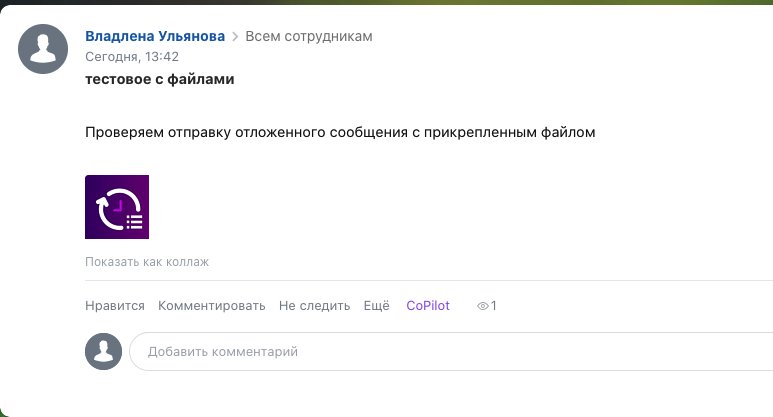 Приложение позволяет отправлять в Живую ленту отложенные сообщения. Запланируйте отправку сообщений заранее и не беспокойтесь о том, например, что не оповестили коллег о важном мероприятии.